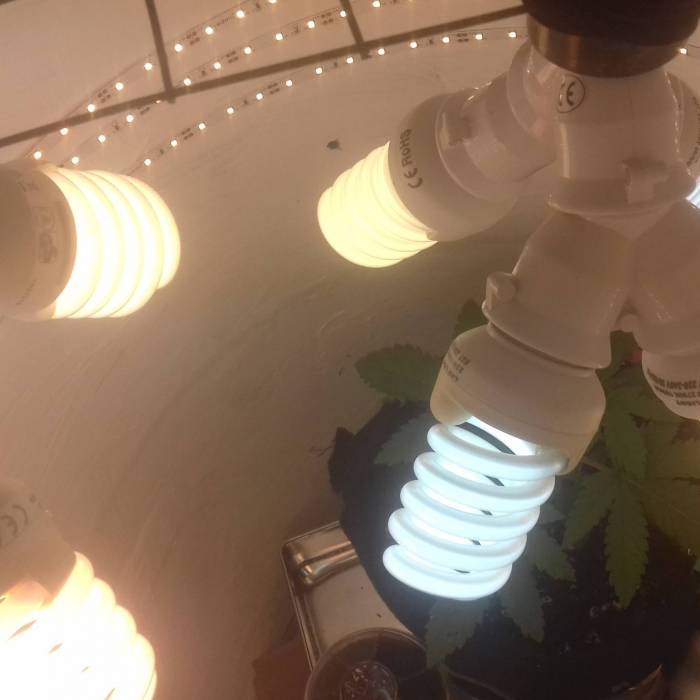 RedEyeJedi420 New adapters come for bulbs so now running 8 23w CFLs. Four of them in the 2700k spectrum and 4 in the 6500k spectrum. Temperature has gone up quite a bit so added an interior fan to help a bit if it becomes an issue going to upgrade the extraction fan to a 220v. Humidity has gone low also at around 20-25 % so going to get a spray bottle and lightly mist as and when needed