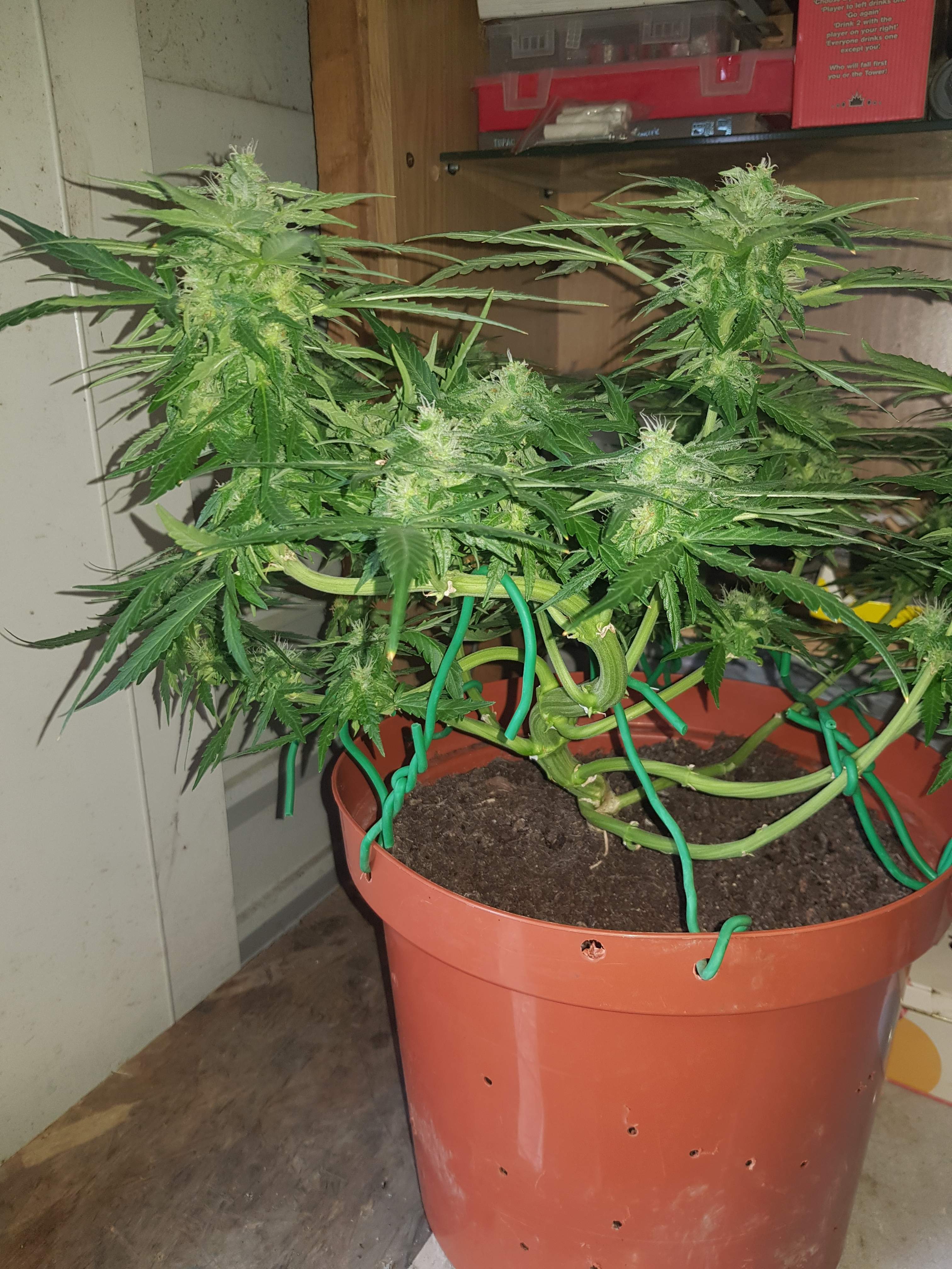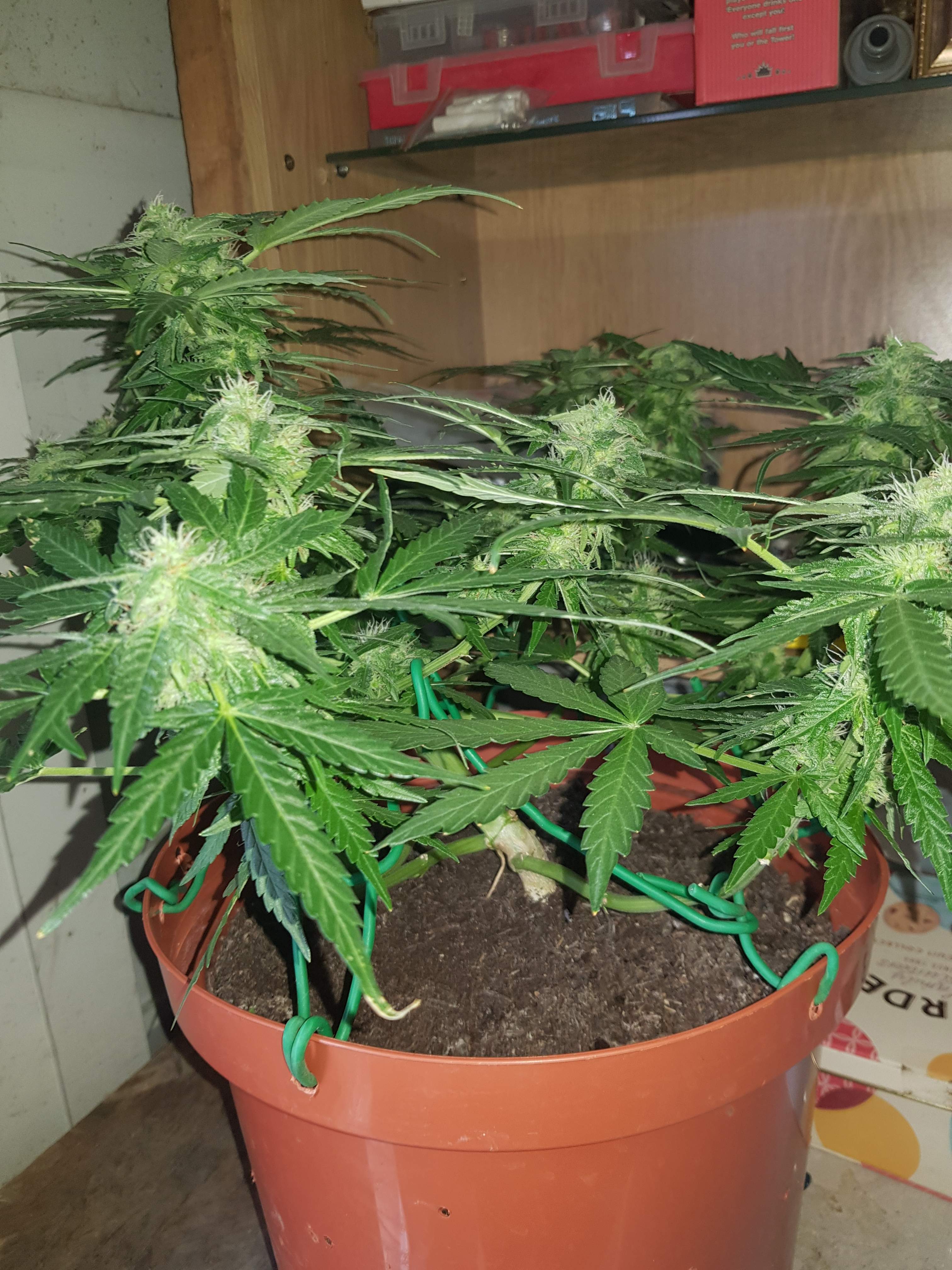 density will impace the guess... 5 colas? maybe 2 oz? i think you were a little extreme on the lollipopping for this size of a plant. you have a lot less time with an autoflower, so the lower growth actually is 'near the top' for the most part. it's a good thing to learn. i butchered the hell out of my last plant in bloom box far worse than what i say here, lol... not too proud to admit it.