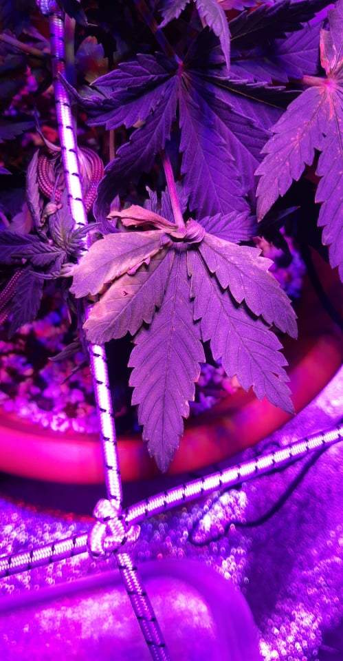This is a Phosphorous deficiency. You can tell by the dark shade of shiny green lower leaves turn and the blue, purple, or bronze spots that appear on them. You'll also see slowed or deformed growth, bright red or purple colored stems, and leaves that curl, thicken and feel stiff before turning brown or yellow and falling off. Hopefully, I answered your question and remember Happy Growing and Free your mind one puff at a time.
