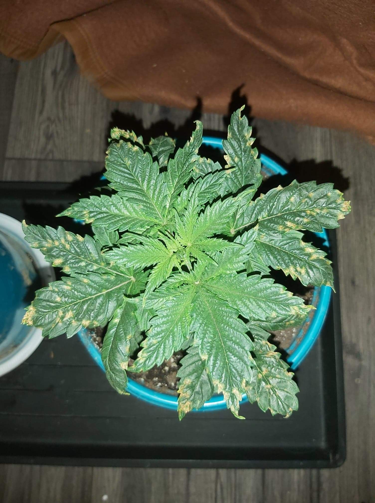 I am growing white widow seeds and there are yellow spots showing on one of my plants how can I solve this issue ? The plant is 3 weeks old , I am watering them with reefertilizer grow 20-5-10 three teaspoons in four liters of tap water from our lake.thank you !