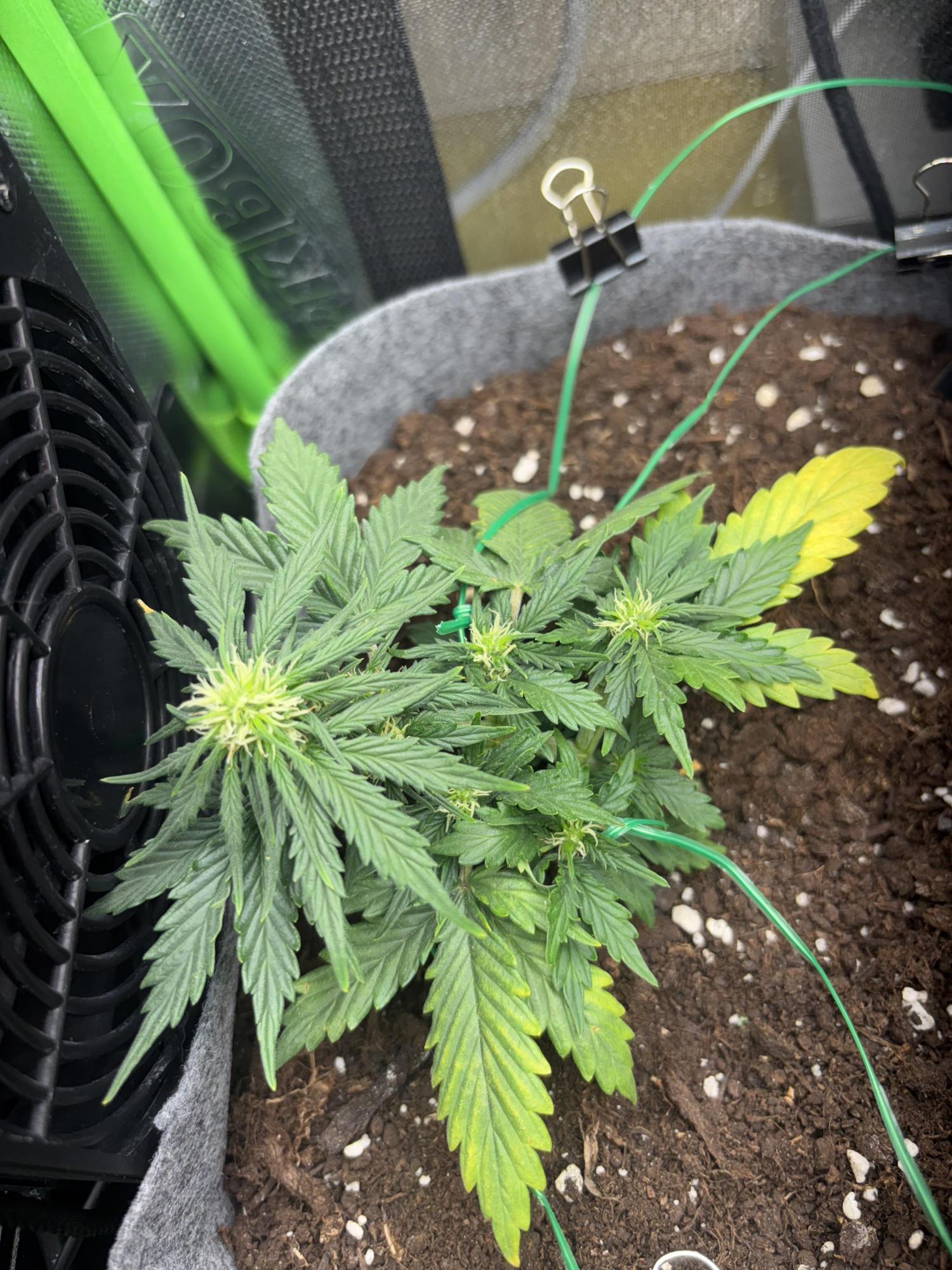 I noticed a couple of the top fan leaves have got some small yellow/gold spots developing. I've been using the same Bloom feed for this plant as my 3 Bears Smile which is 8 days further along. I'm wondering if that might be causing the problem and how I fix it.