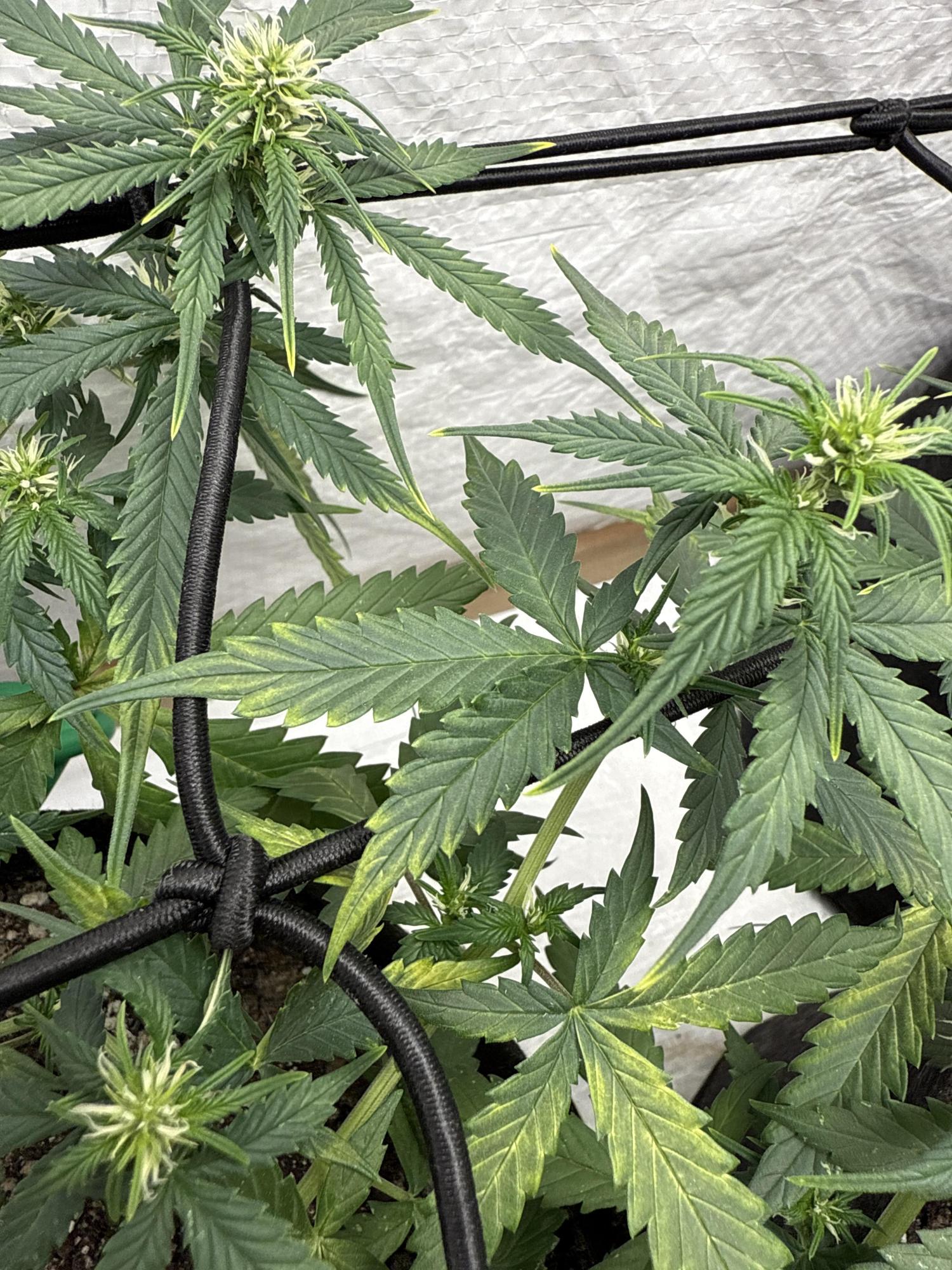 1/4 plants yellowing it’s the biggest and is the only one that fell victim to a topping in veg, N def? The interveinal stuff is making me think magnesium too? What y’all think…