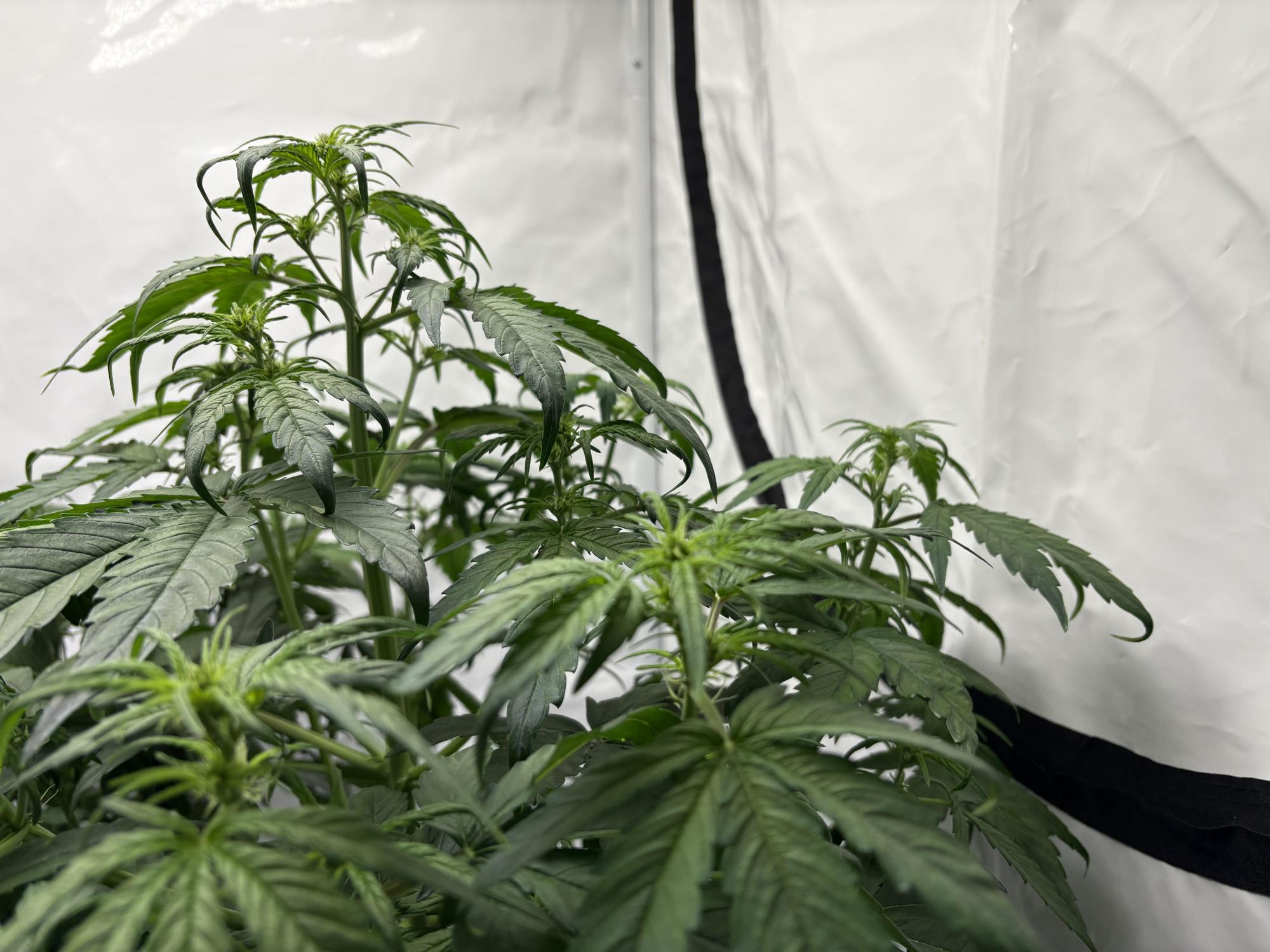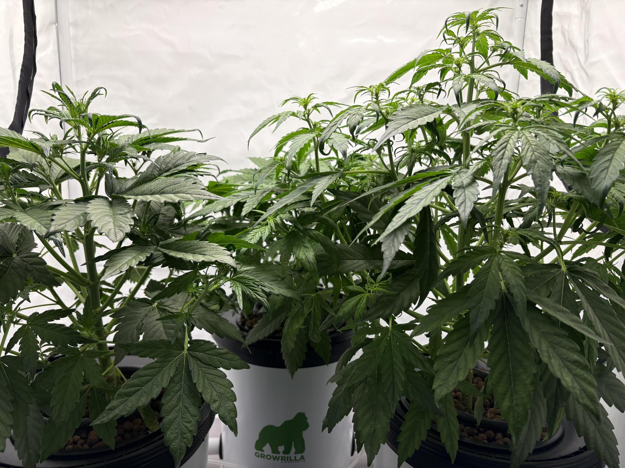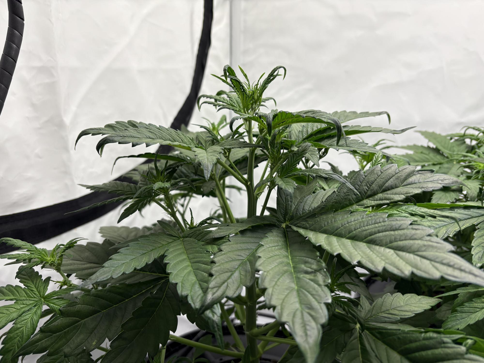The downward curling leaves could be a sign of nitrogen toxicity. When plants receive too much nitrogen, they tend to develop very dark green, shiny leaves that curl or “claw” downward. Even if the EC is not extremely high, an unbalanced nutrient ratio with too much “Grow” or nitrogen-rich fertilizer can lead to this issue in DWC systems. To fix it, reduce the nitrogen input by lowering the Grow component or adjusting the nutrient mix to a more balanced ratio, and maintain a moderate EC around 1.0–1.1 while monitoring new growth.