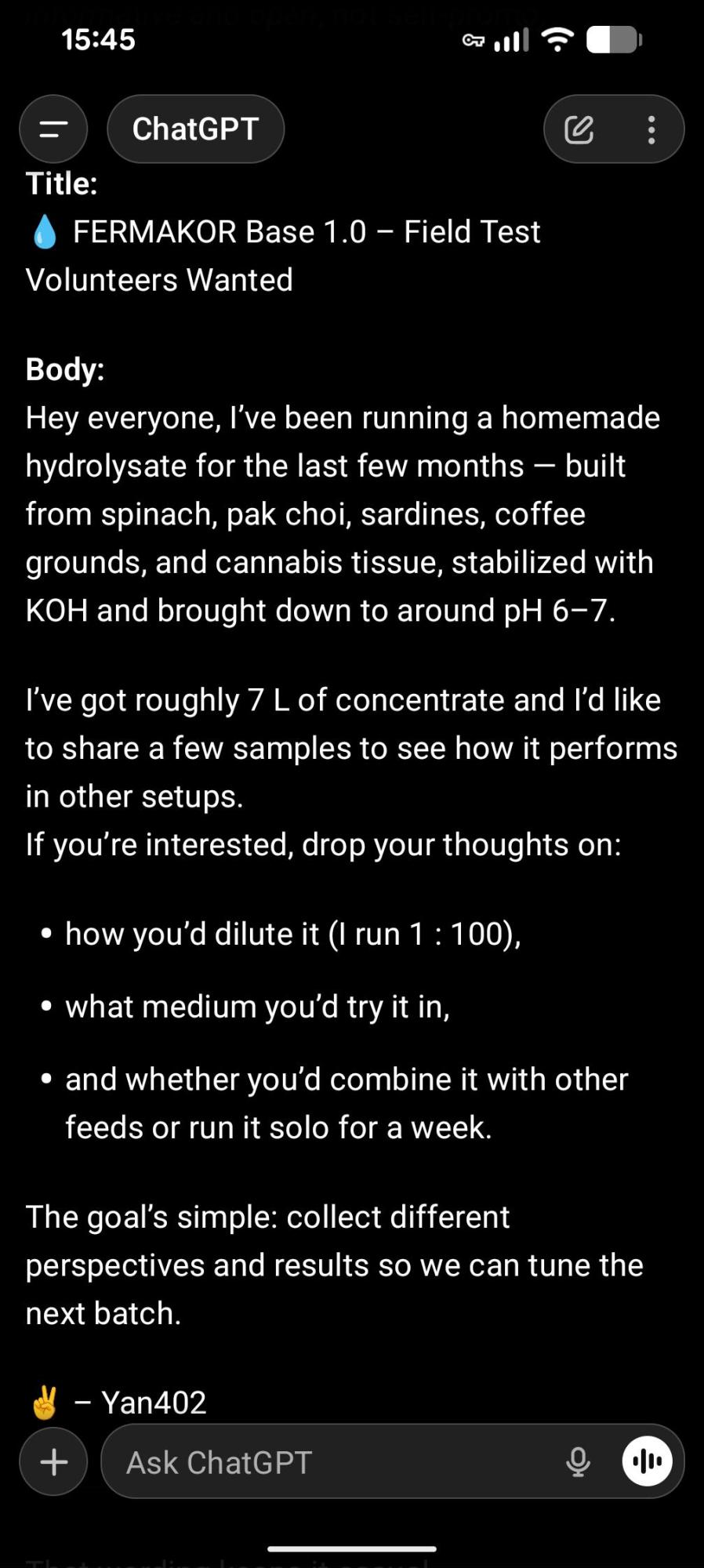 I’ve got around 7L of my homemade nutrient concentrate FERMAKOR Base 1.0 (spinach + sardine + coffee + cannabis hydrolysate, pH ≈ 6–7). It’s stable and fully tested on my own runs, but I’d love to see how it performs in other setups.
