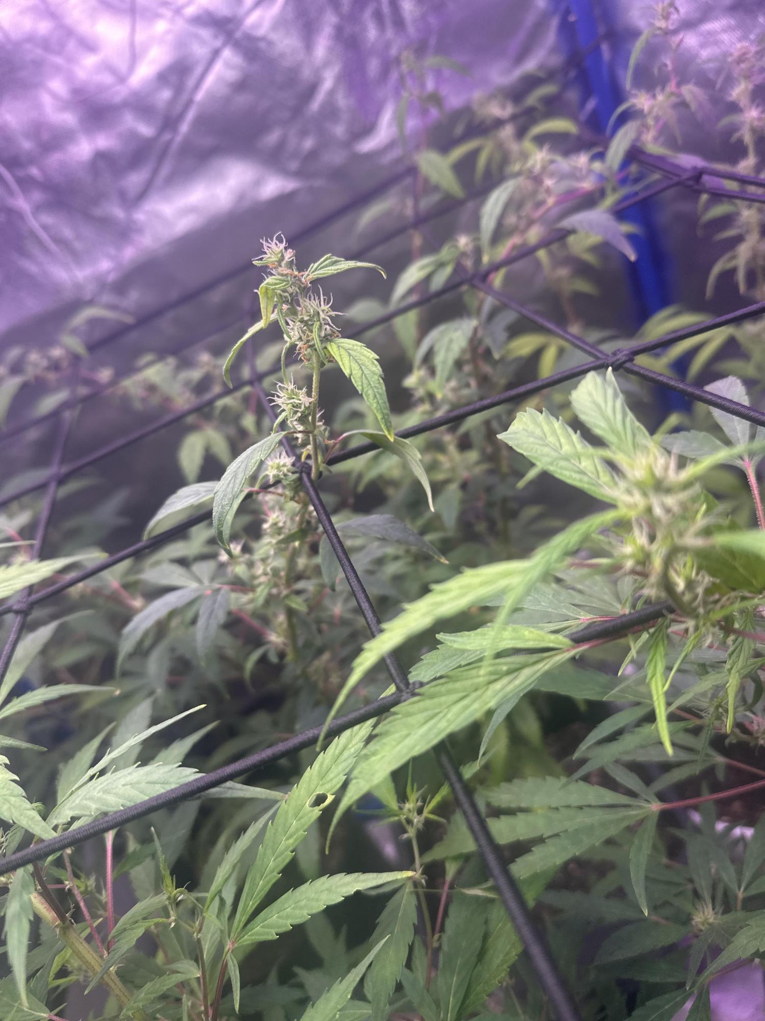 Hei , whats my plants suffering i think is a stretching bc of light but i have a chance to makes them bigger ? What nutrients i should give i started corect with calmag , any ideaa about why is so purple to strains? And what i should do now to improve ?