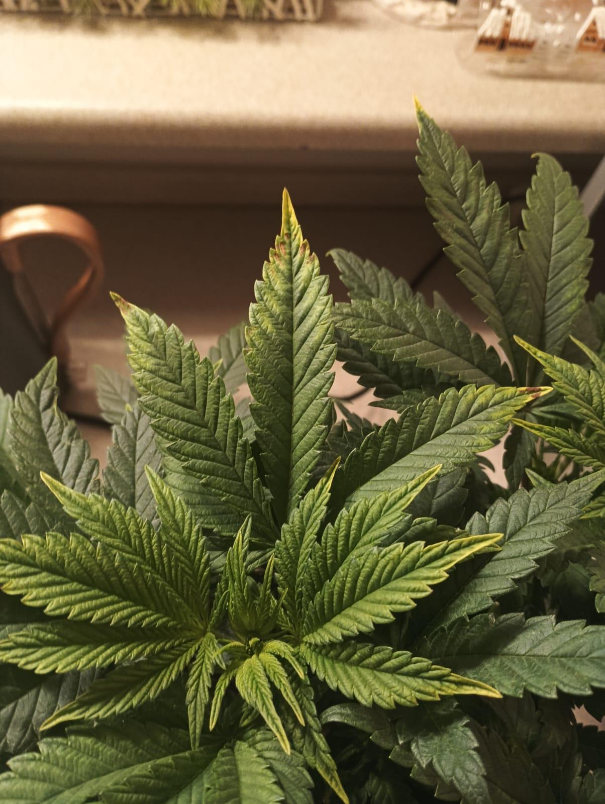 too much p or k cna burn the serated tips and cause chlorosis up top... low k and a couple trace element deficiencies can, too... so it's not even overty a deficiency or a toxicity, necessarily, judging by leaf symptoms alone.