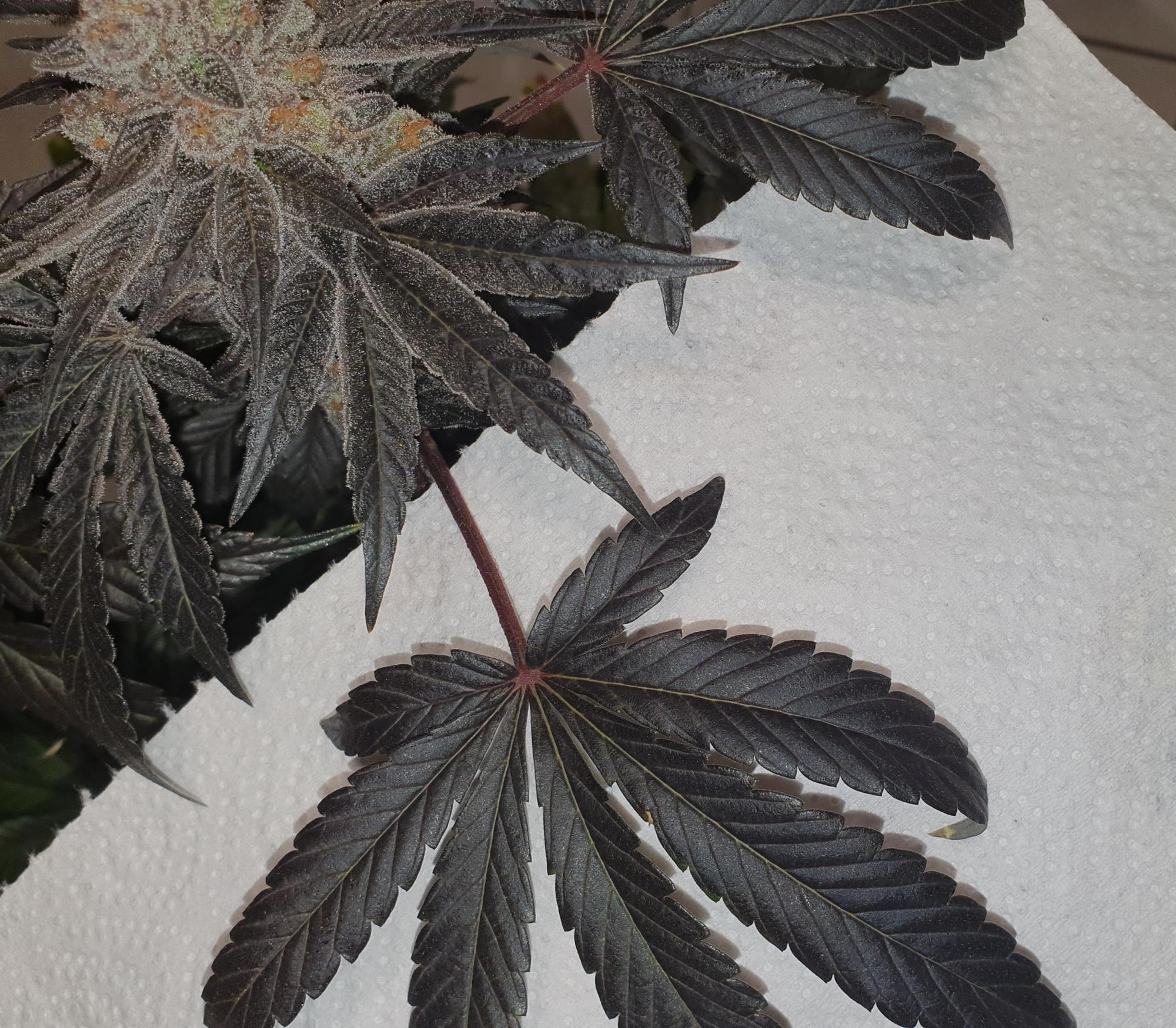 But, dark leafes are a sign of to much metal nutriens, iron, mag, ect. but its realy to late to do somthing. Happy Harvest :)