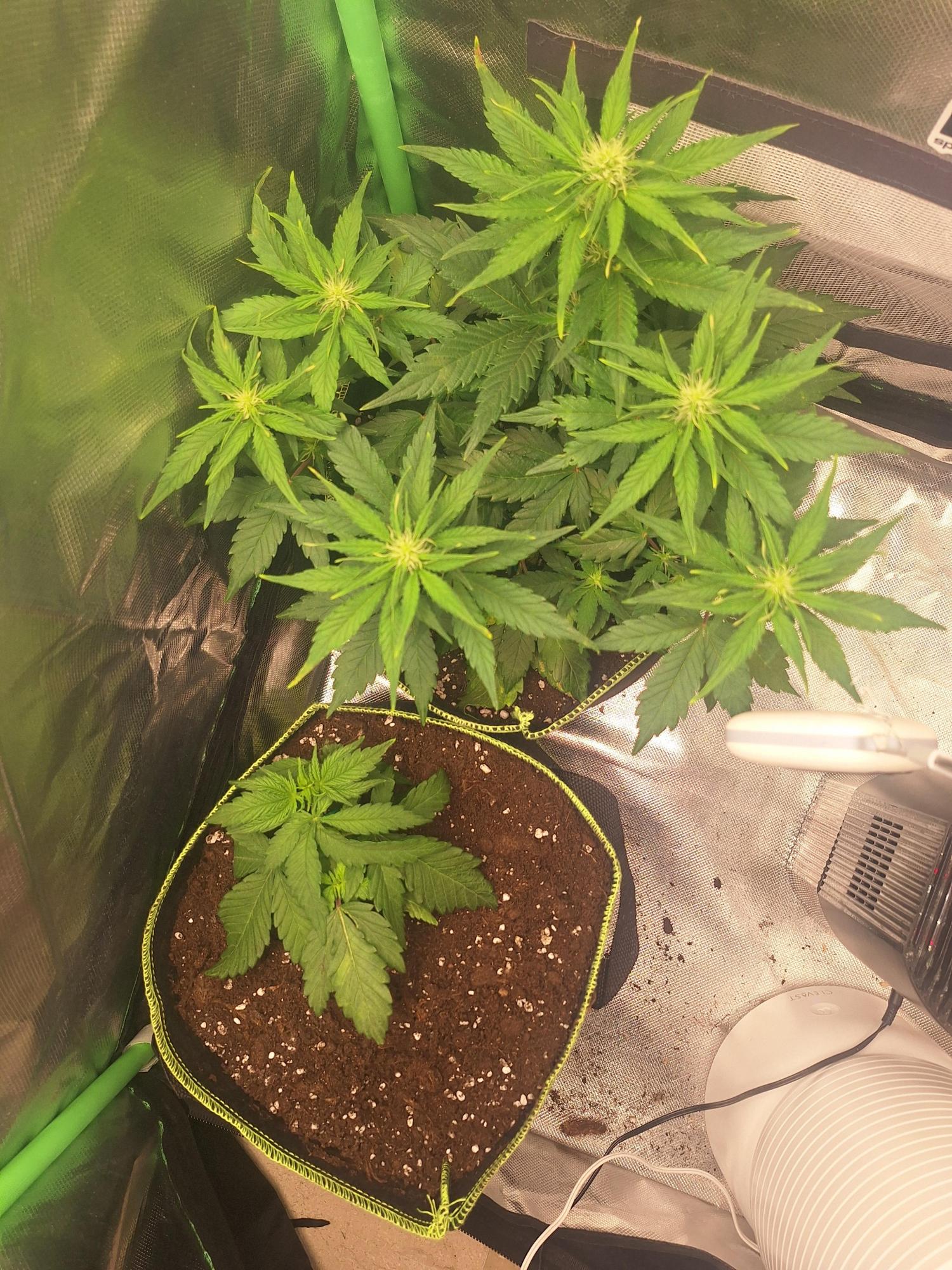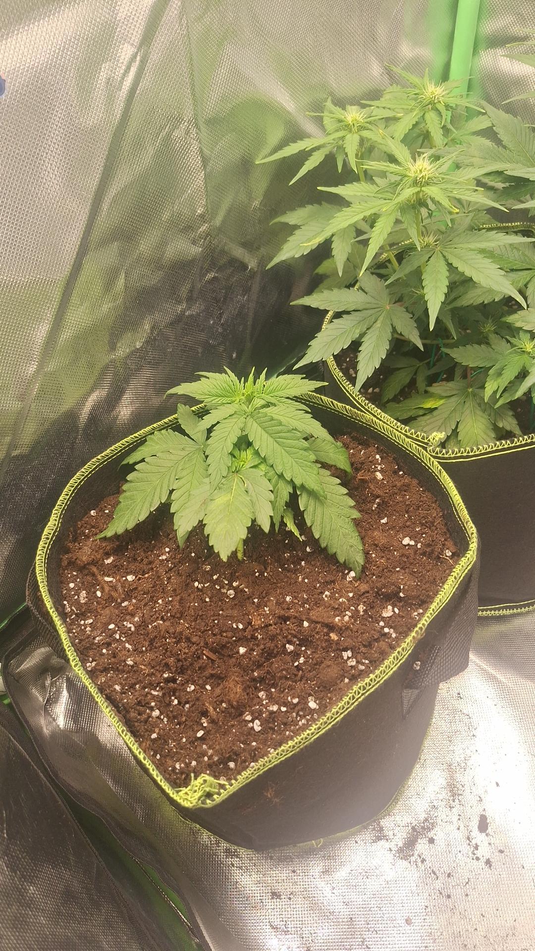 Hi guys, I planted my first photoperiod plant. Seed bank unknown, it was a gift (≈3-year-old seed). Setup: SF1000 at 80%, 24°C on / 20°C off, RH 65%, Lightmix + 5% perlite, transplanted recently into an 11L pot. After 4 weeks it’s very slow. I did LST yesterday but removed it