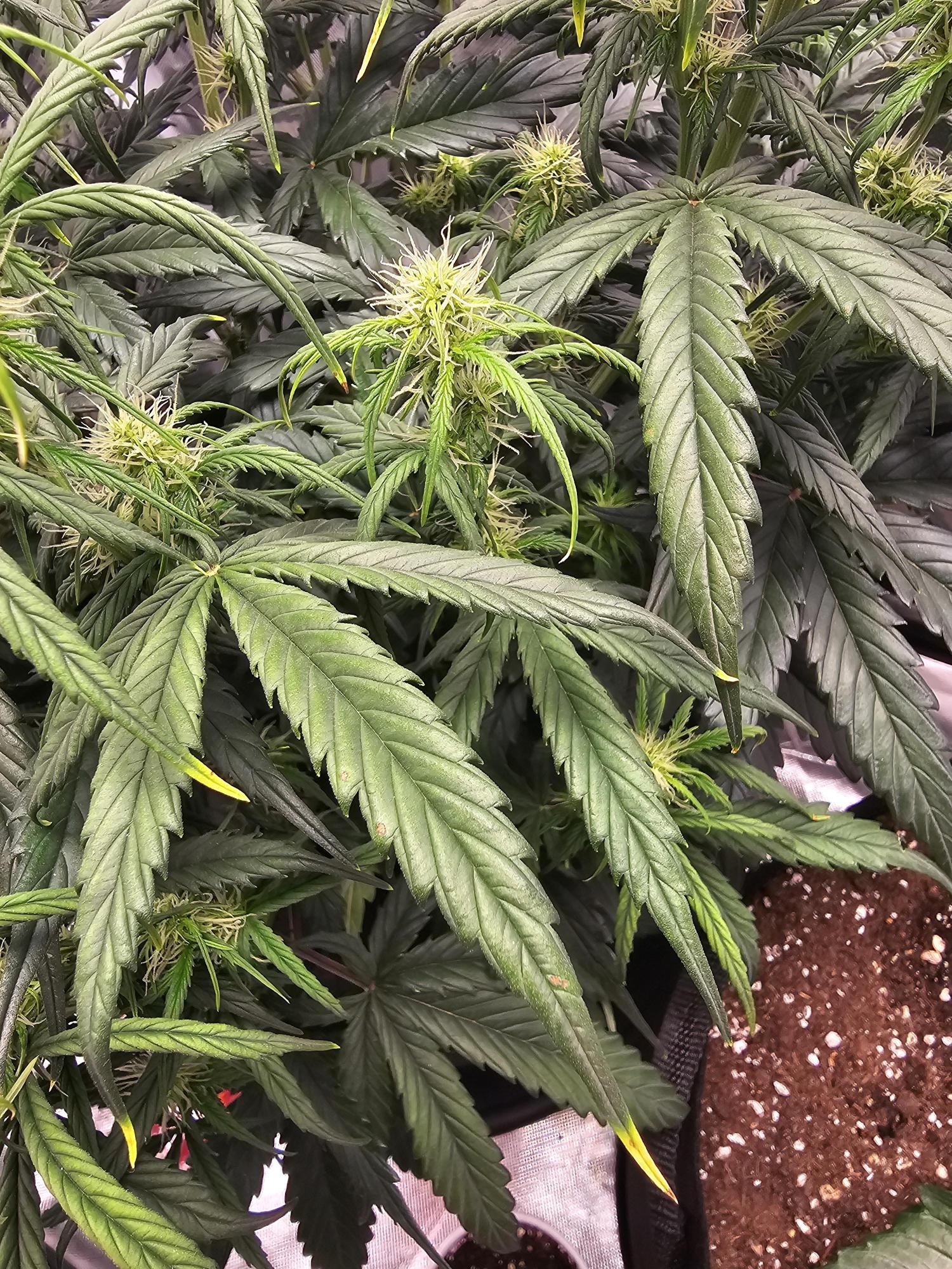 Hey, i checked you dairy. You fed her only a organic grow fertilizer used for vegetativ state. If cannabis is fed only with an organic 5-3-3 fertilizer through flowering, leaf symptoms usually show a nitrogen excess and a phosphorus/potassium deficiency. Leaves stay very dark green, often thick and heavy, with slightly clawed tips. During early to mid flower, lower and mid leaves may lose vitality, show dull coloration, weak turgor, and later develop edge burn or necrotic spots from potassium deficiency.