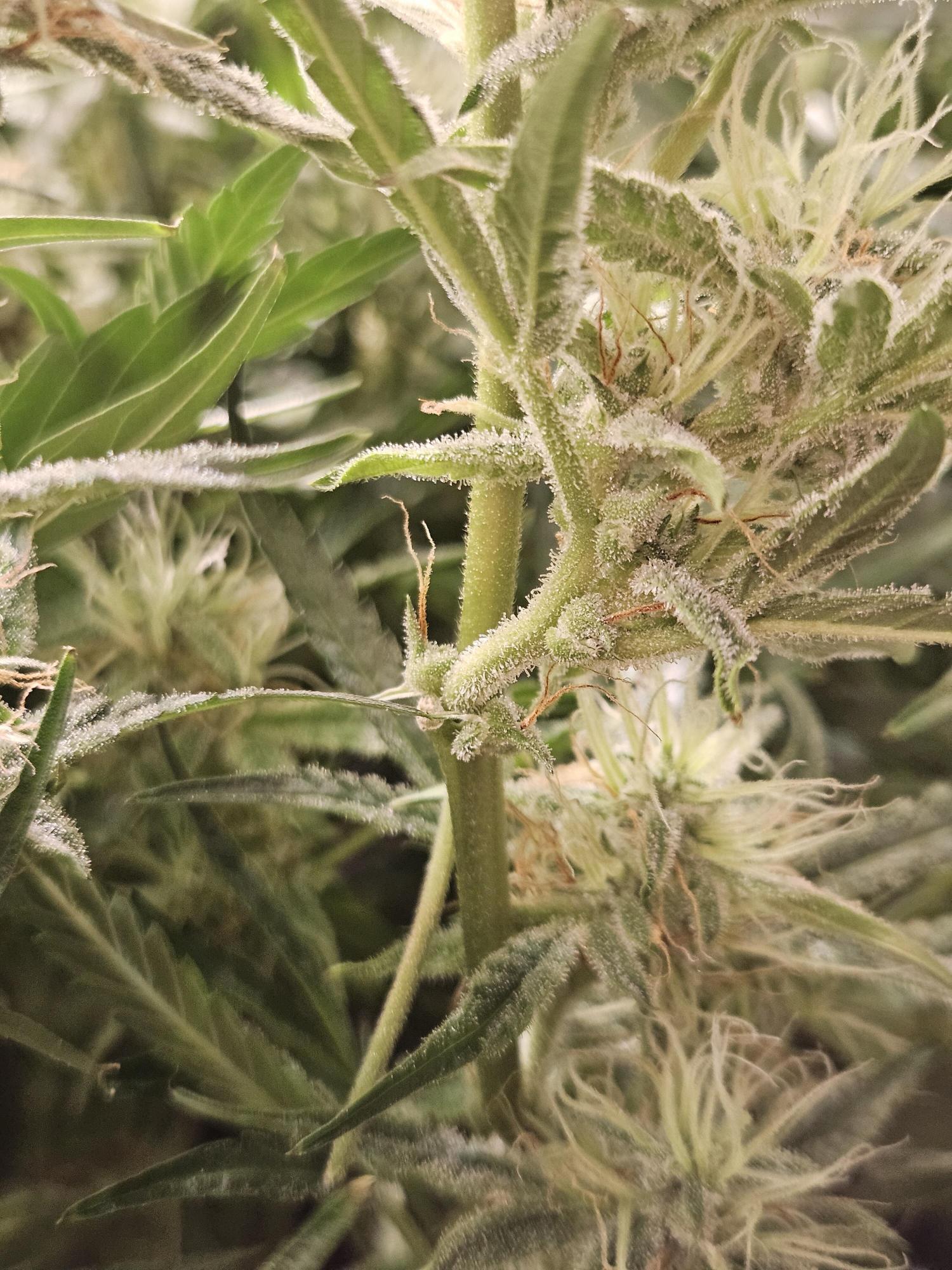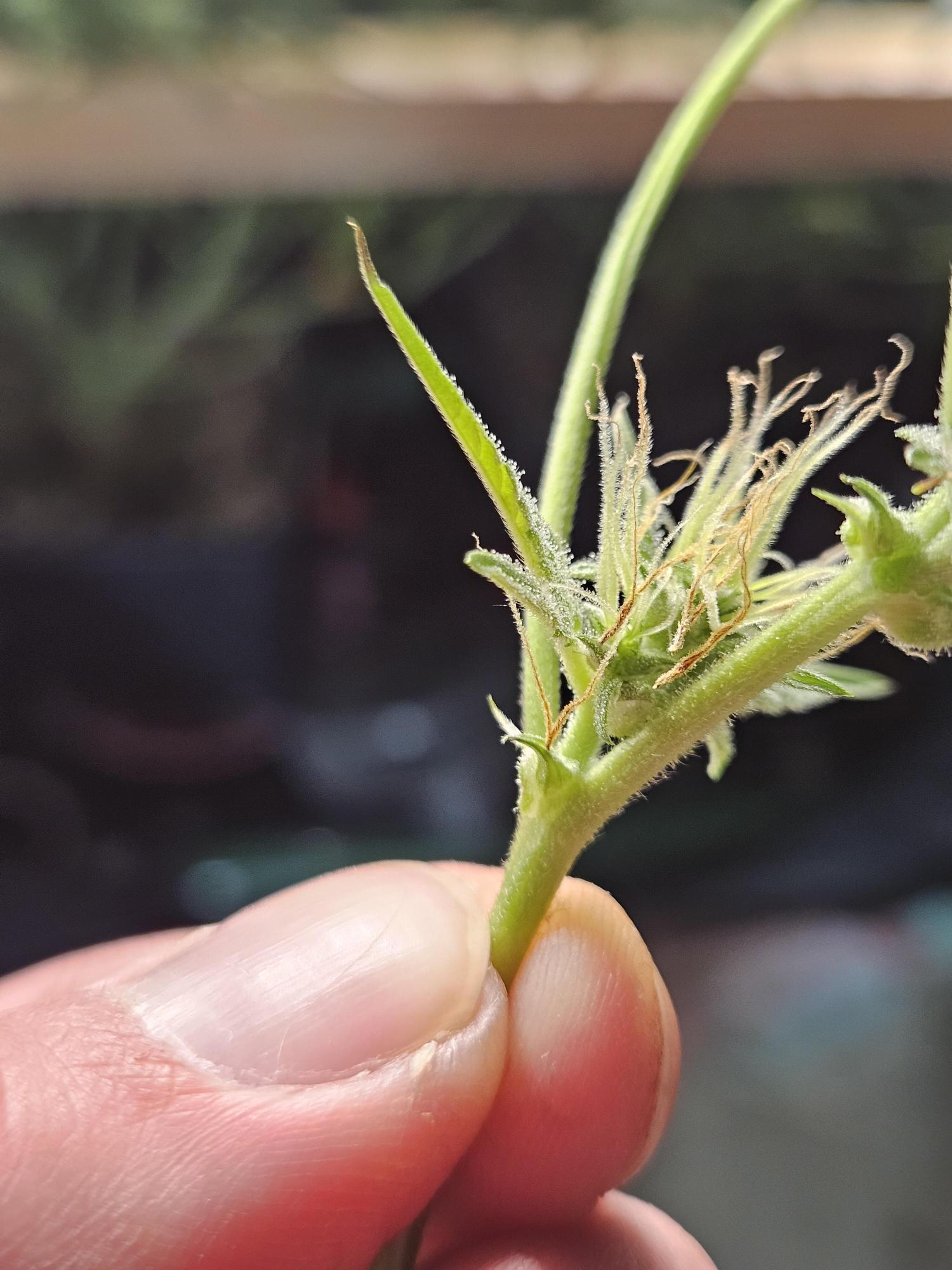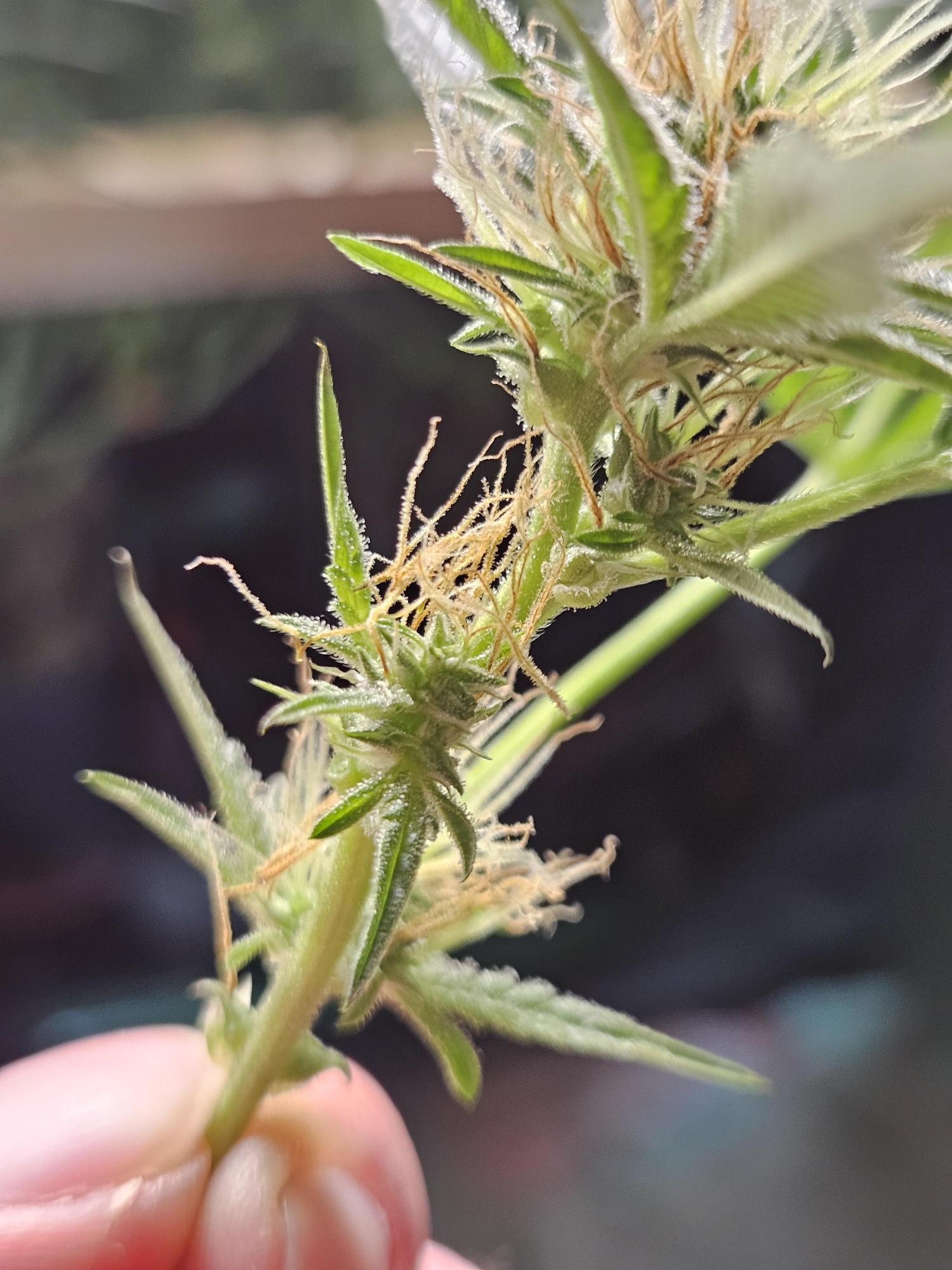 Could be a few different things. Could be over feed causing lockout of certain nutes and shes trying to finish early. Could be too much light. A few leaves have burnt tips folding up and a couple other leaves clawing which could indicate too much light and cause it to change sooner. But from my personal experience, when this happened to me, it was pollinated. Hoping its one of the first 2 for ya, but if not, you at least get some free seeds to grow with. Some people will argue using the seeds if that's the case, but I've run several grows using seeds from plants that hermied or got pollinated without issue. They can be more temperamental, but still usable.