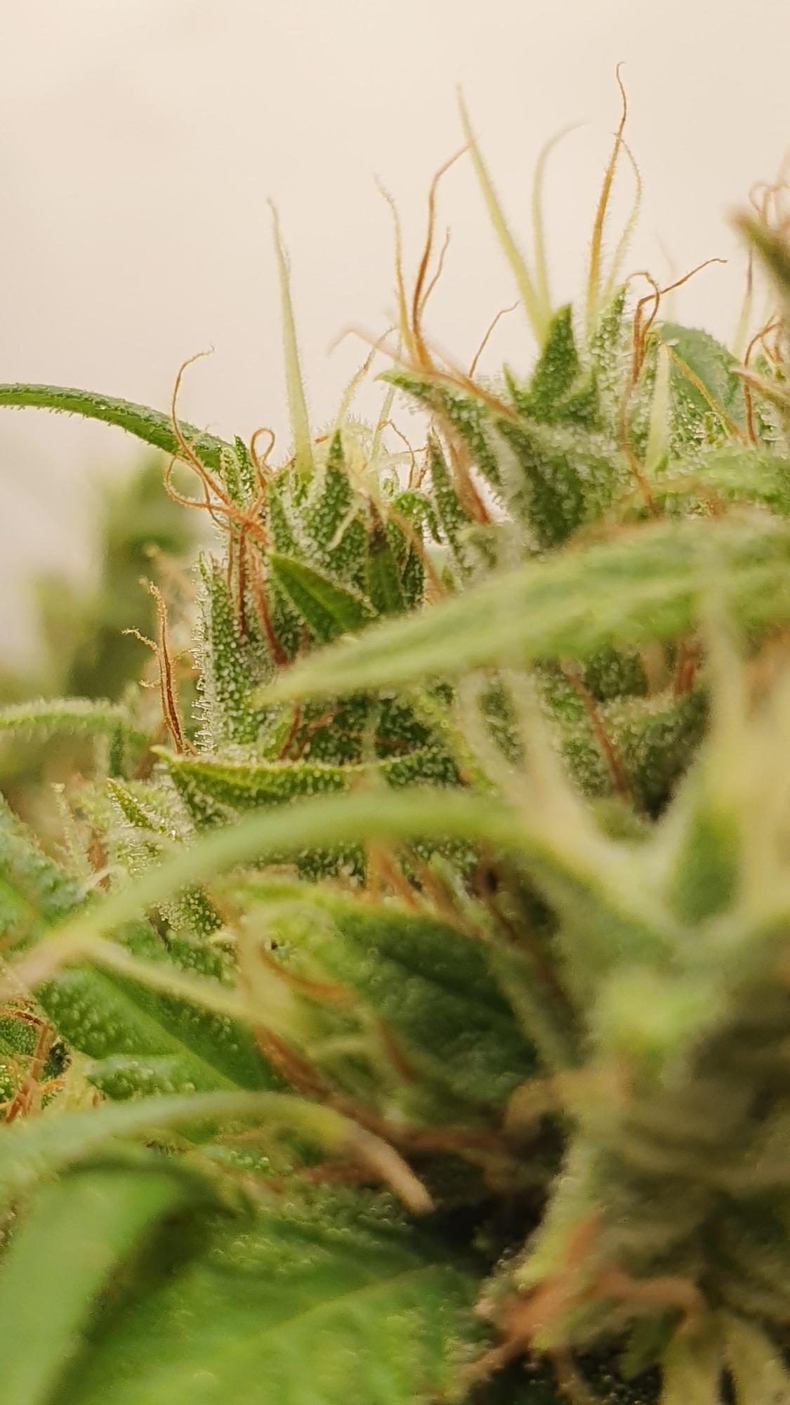 This girl is almost week 4 of flower and is getting real bushy. Have some of the pistils become damaged by the leaves and should we defoliate?