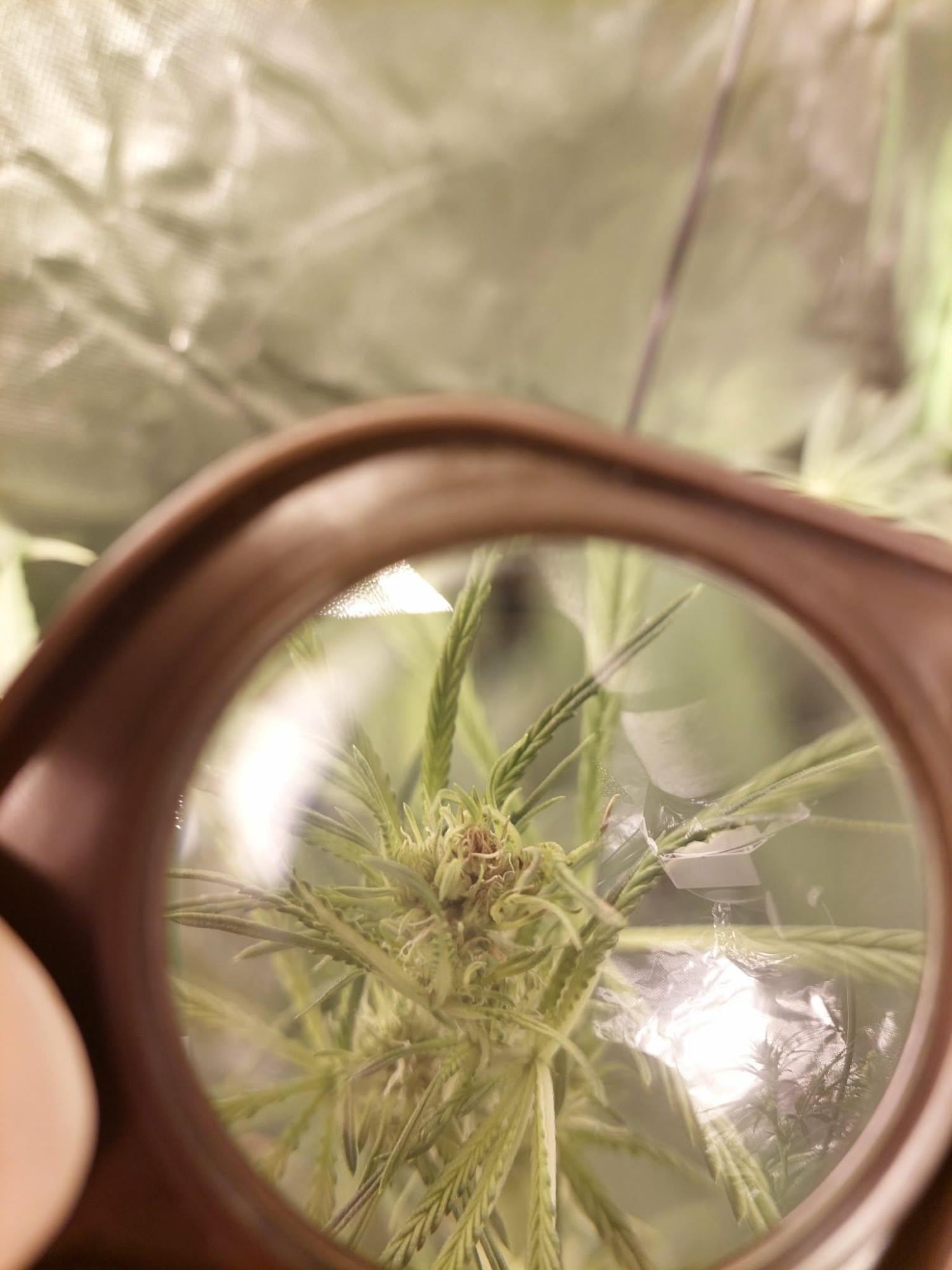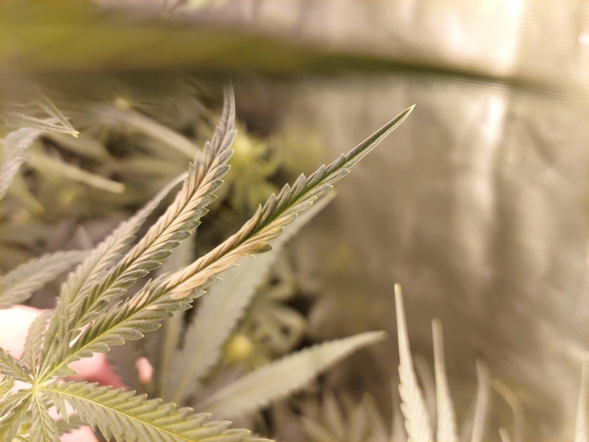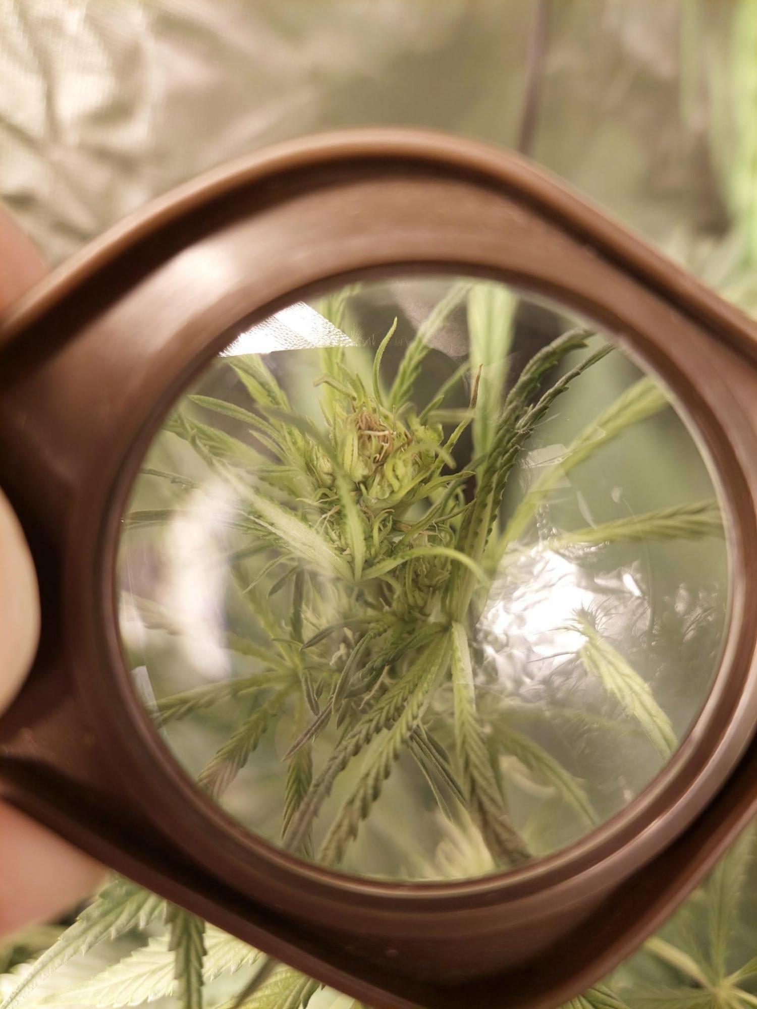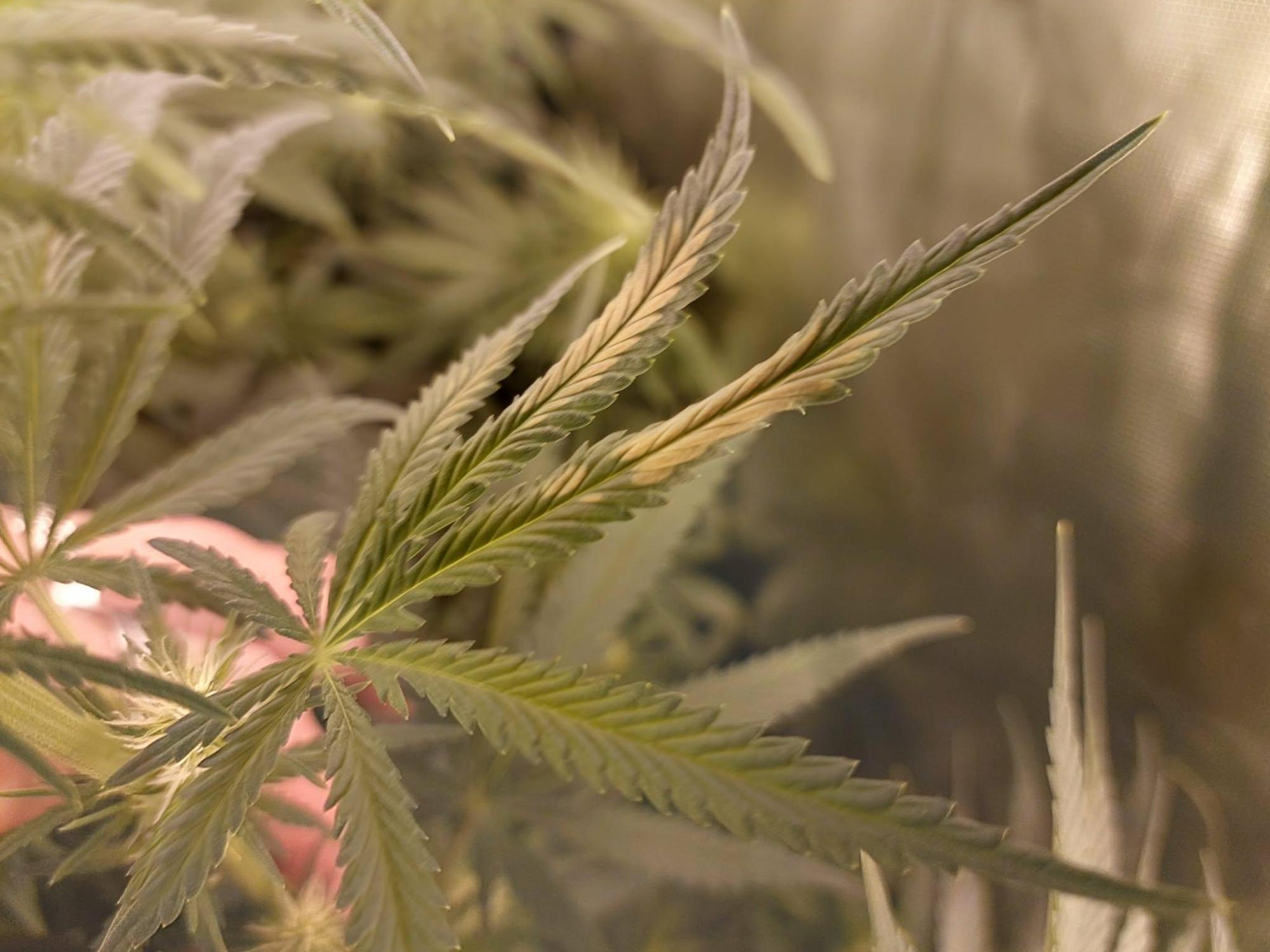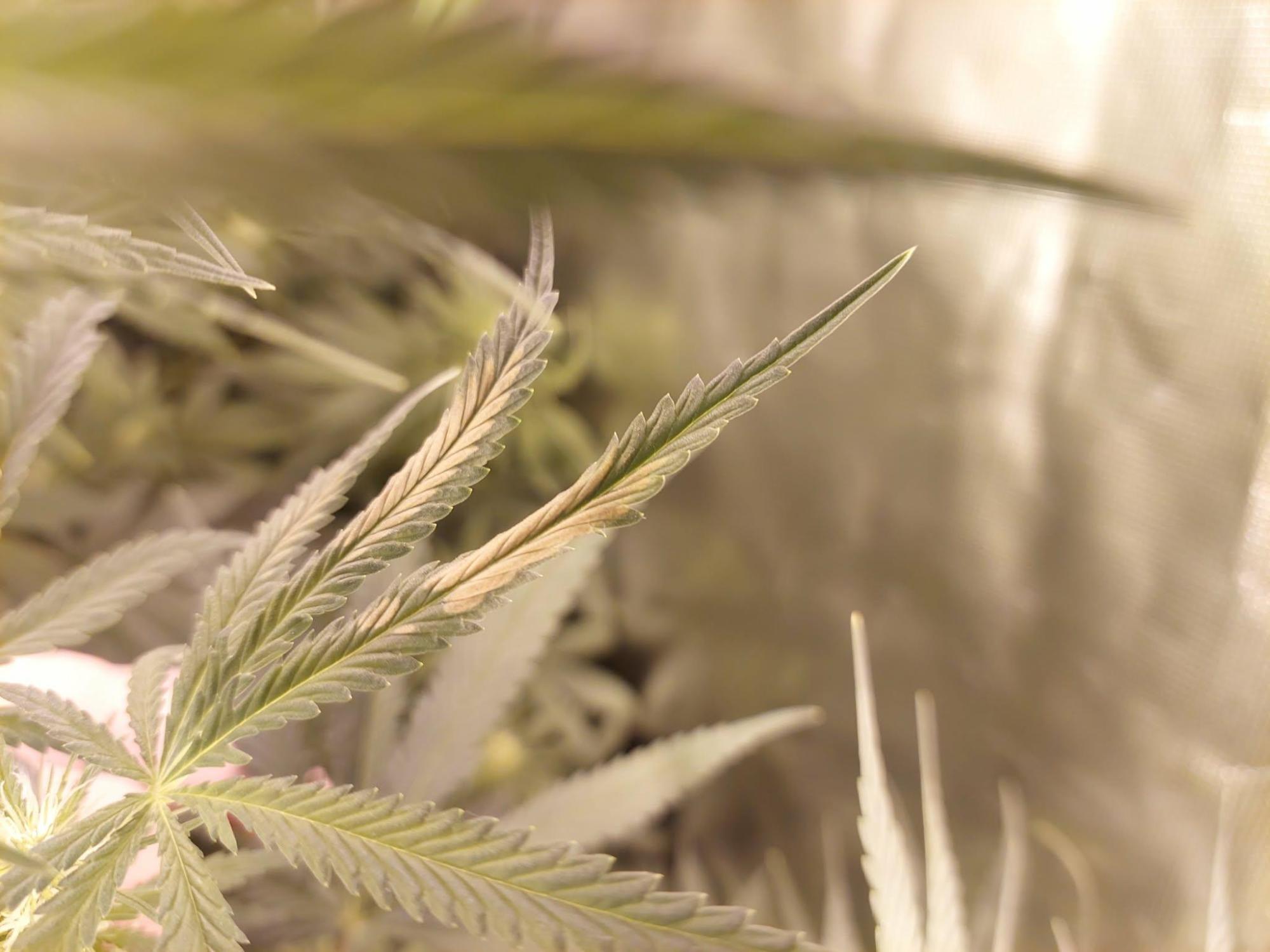 W3 flowering/stretching, RH at 40%-50%, no wilting signs, no smell, no mushy texture. One plant has the top bud looking like this and the sugar leaves photos are from another. Both plants are sativas and close to the light (50-60cm away). Were a bit underwatered up until recently