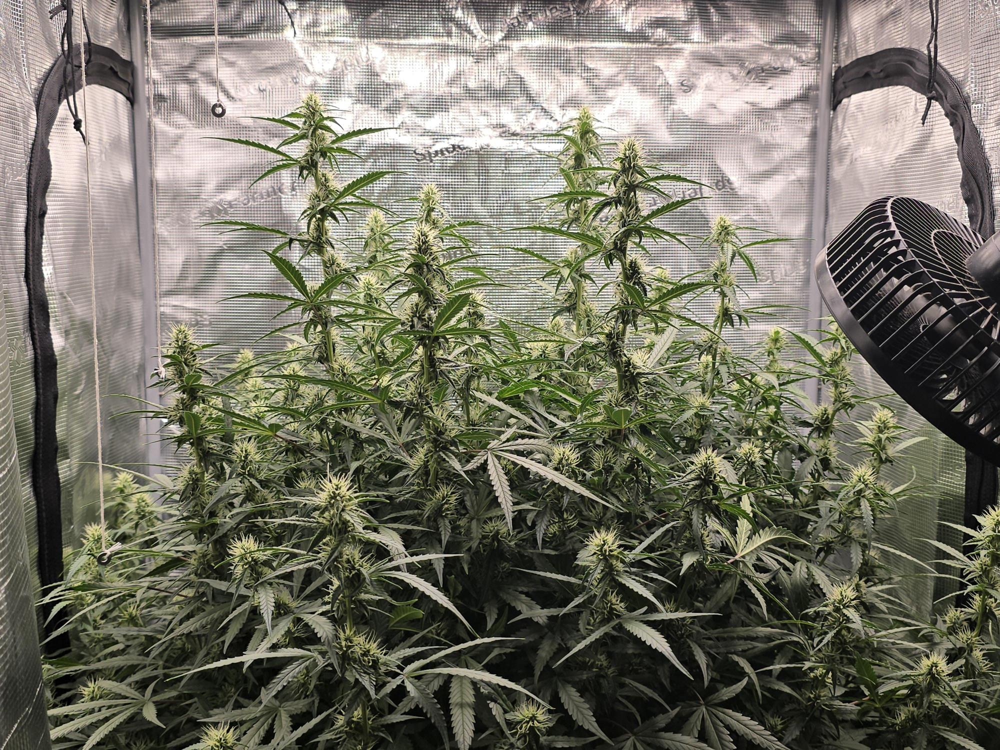2nd grow, first one was a massive flop lol. 58 days. Autoflower but unsure as to strain. 420 watt led light in a 100x100x200 tent. Question, should I trim it back?