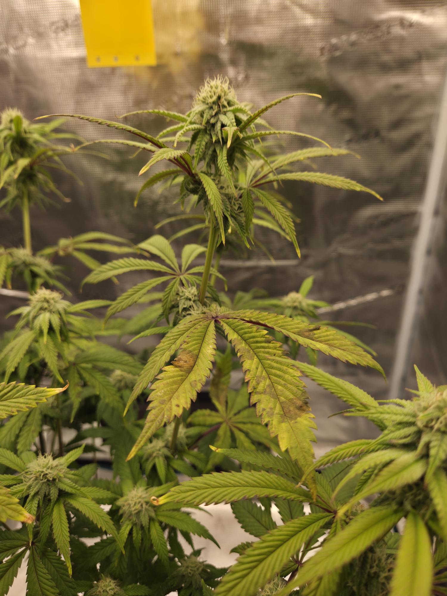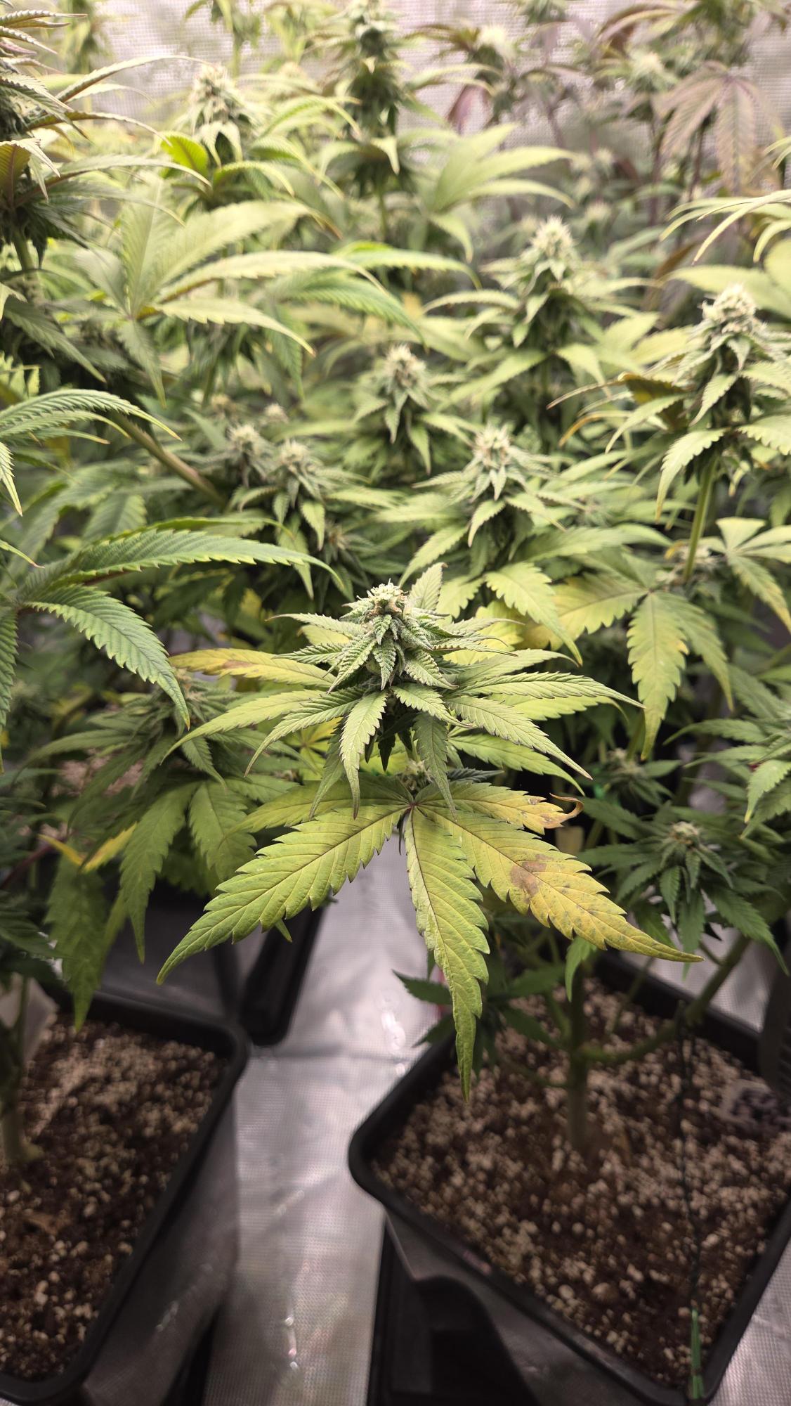 Buds are forming, plant isn’t dying. You’ve got stacked mild stress, not a disaster. Let the pots dry more, feed lighter and consistently, don’t flush or chase deficiencies, and stop changing things every watering. She’ll finish just fine.