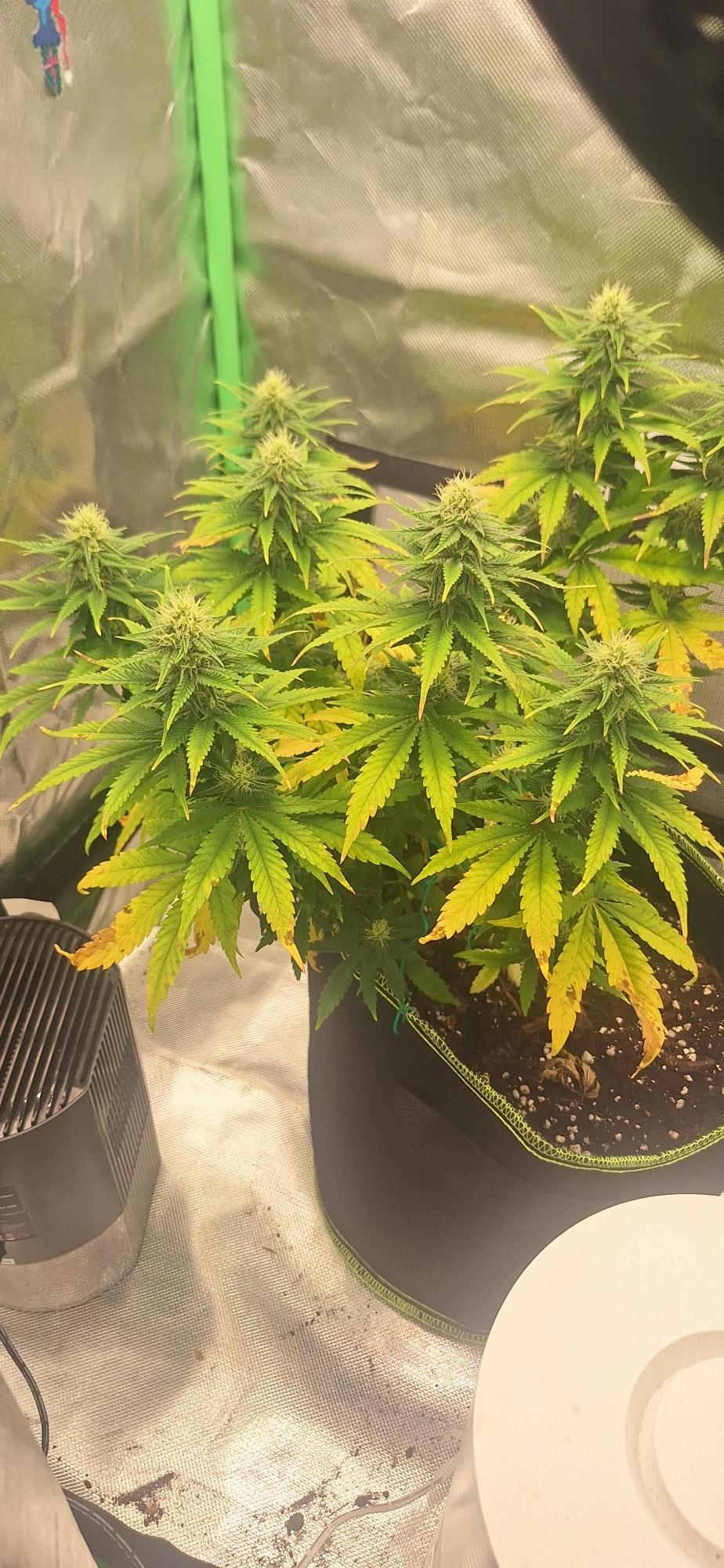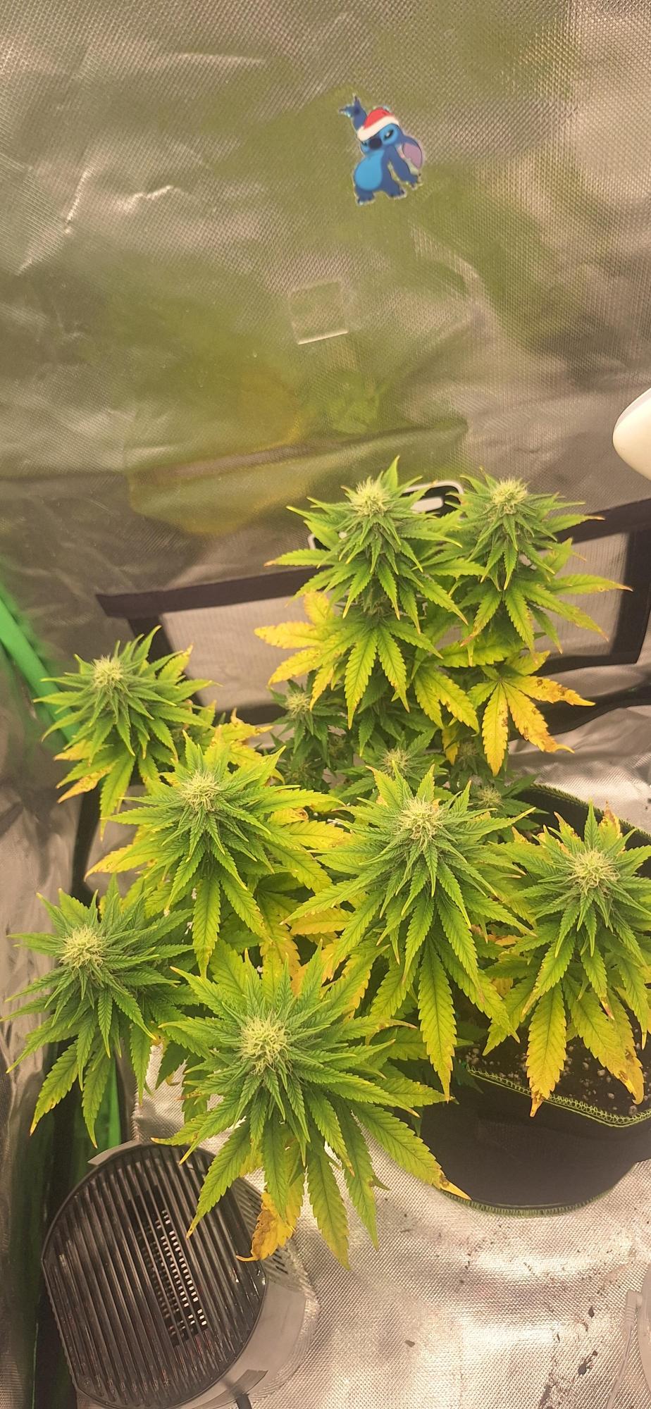 Tap water 363µS, base EC 0.49. Using AN pH Perfect G/M/B. Water test shows no Ca/Mg → suspect imbalance. Deficiencies ~1yr, now yellowing. Last feed 1ml/L BioBizz CalMag + 3ml/L G/M/B, EC 2.8 (before ~2–2.2). Runoff 0.5–0.6. Mostly fertigated. Feeding started wk5. Its photoperidc