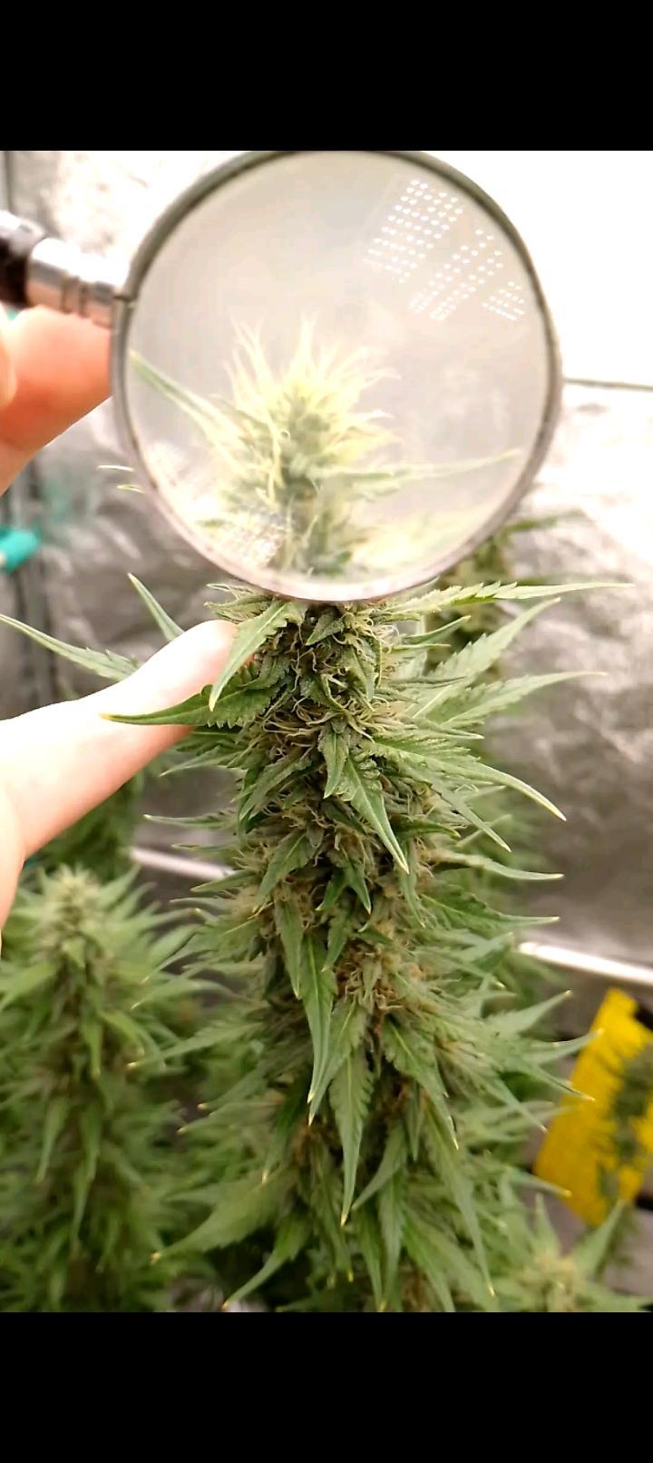 Du möchtest einen Erntezeitraum im THC Peak — du musst ernten, wenn der größtmögliche Anteil deiner Trichome milchig ist, mit dem kleinstmöglichen Anteil an bernsteinfarbenen, aber auch dem kleinstmöglichen Anteil an durchsichtigen Trichomen.