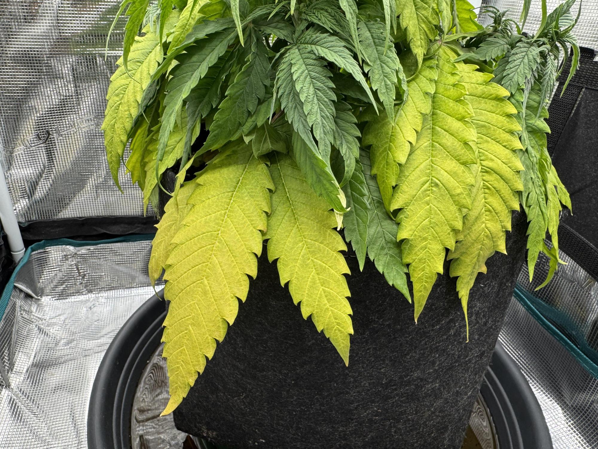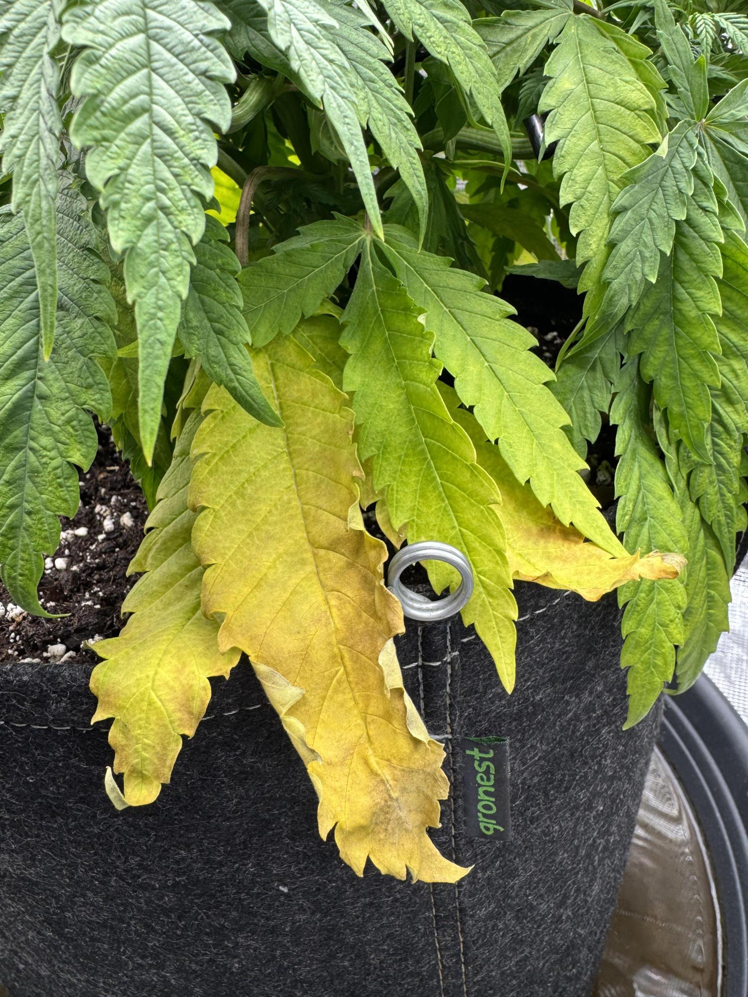 N deficiency -- if not a side effect of what is causing the drooping. N-deficiency symptoms are about as discrete as they can get.
