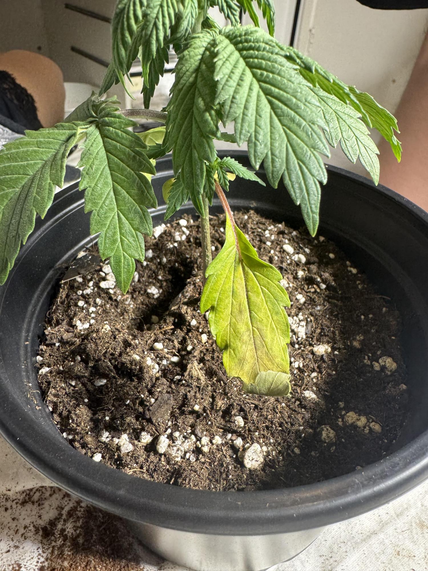Wk 3 Auto. Yellowing, Curling up. Stem??. I Have transferred it to a bigger pot with regular soil mix but photos were taken when it was in Light mix. Should I prune them? Over watering Problem or Nutrient Problem or something else? Help as I’m a complete beginner! My first plant
