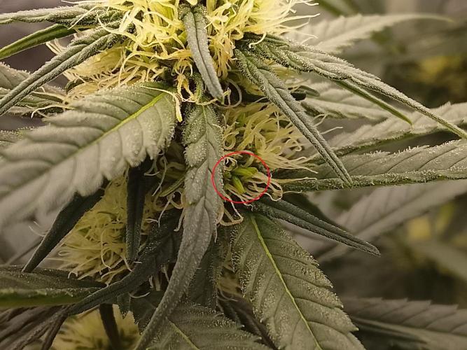 Did my Pink Runtz hermie? Photoperiod, Day 45 of flower. Found what looks to be seeds. Took one of those bulges and popped it, liquid squirted. The past few days temps fluctuated between 26 and 22 daytime, 18-20 at night, because of lung room temps changing. What should I do?