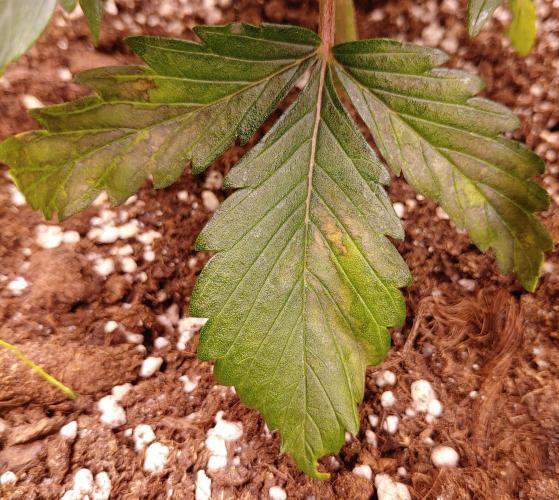 The fan leaves of the 2nd & 3th node have developed dark spots on the leave. What is this? and what is best to do?