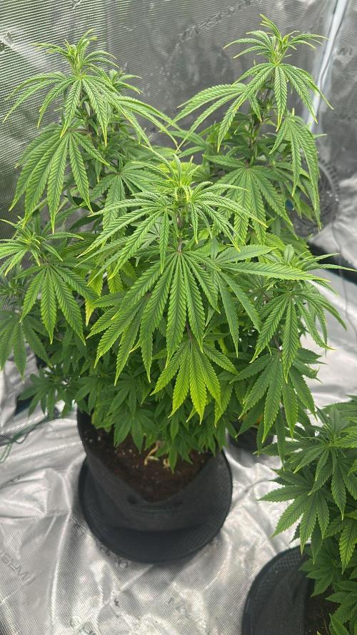 Growers, please help! My Northern Light Blue (Sweet Seeds) is in week 5, just entered preflower. Temps 26–27°C, RH 50–60% (up to 67% lights off). Soil: Plagron LightMix. Feeding only FishMix 1ml/L. Leaves look small, plant seems sad. Why so weak or slow growth?