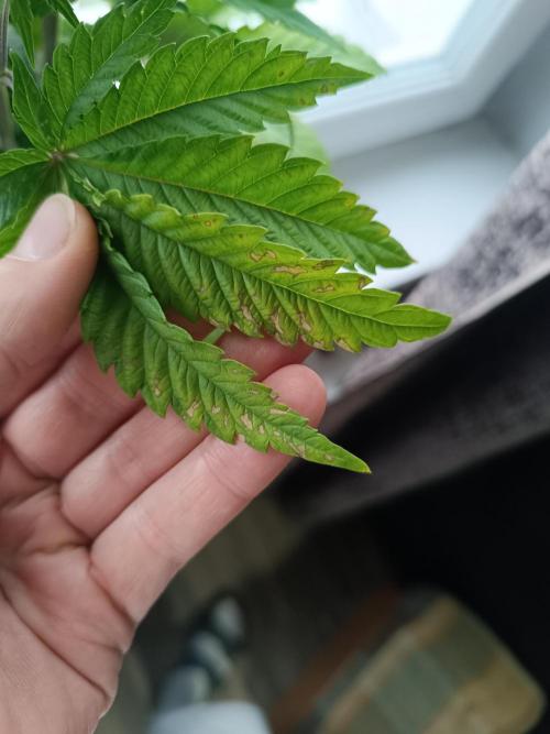 Northern Light Blue auto, week 7. One heavy watering weeks ago and another 4–5 days ago while the pot was still moist. Since then: droopy leaves, spots, no recovery. Pot still heavy after 4 days drying. DLI 30–35, 18h, Light Mix + ADV. Overwatering or root damage?
