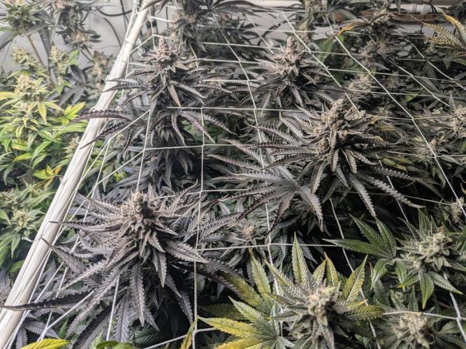 Listy jsou poškozené nahoře. 5 týden květu a na jedné kytce se objevilo tohle. Jinak zbytek zdravý. A světlo spider farmer g4500 na 100% a 40 cm vysoko. 11 litrový květináč, 4 litr vody -4,4calmag-8,8bloom-4sumo-2pk.Vstup je pH 6,5 -Ec1,6. Výstup ph6,3 -EC 2,2. Díky za radu