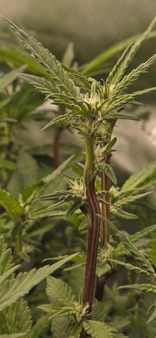 My Blue cheese F1 is acting weird she is so compact and 33cm tall I did not top her, but no a side stim is going for a stretch. Also her leaves worries me a lot of 3 fingerd leaves. She's a bit bouji Is she okay or should I help her somehow?