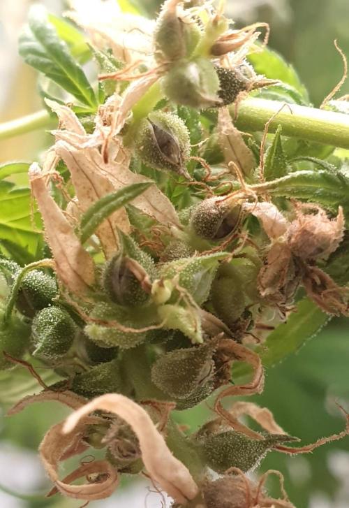 My Canned heat #3 Plant grew up past the light in a 2x4 tent and pistils got burnt and the smell has gone away. Was waiting for bigger tent and light but now this light is too hot. Its around 78° week 5 of flower which is too high i think. Light is only at 55% as any higher will