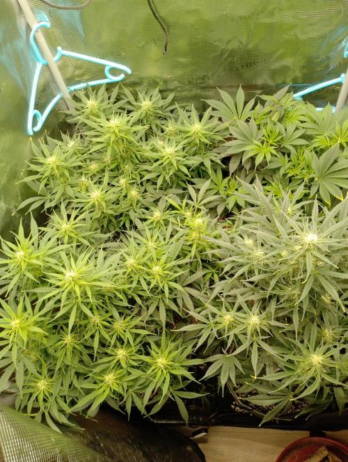 At day 48 of flower on this blackberry kush and mimosa x orange punch which are 8 to 8.5 week strains from what ive read. Blackberry looks close but mimosa doesnt.doesn't. Bbk on the left full of orange hairs. Mimosa x op on right and looks like it has fox tails