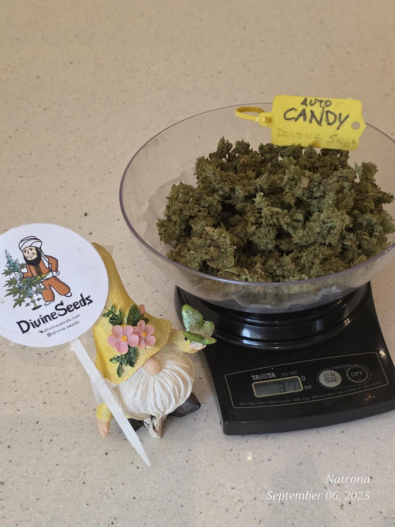 With Auto Candy Divine Seeds presents a very bright example of how delicious autoflowering strains can be! Amusingly resembling melted sugar when blooming (and caramel when dried), this strain has quickly won affection of gourmets and those having a sweet tooth. Genetically 75% Jamaican Indica, Auto Candy doesn’t simply possess a fancy flavor: there is something clearly Jamaican about any moment you spend with this plant. Approved by the local valuers from Jamrock, Auto Candy represents 100% authentic rare genetics. Utterly universal, this strain can be conveniently cultivated strain indoors as well as in the sun, in balconies and greenhouses. Indoor Auto Candy plants normally reach 90 cm height, whereas outside ones can grow up to 120 cm. Taking about 60 days to finish blooming, it can yield heavier and appear more potent if given 1-2 weeks plus. Thick growth on the sides of plants makes for a higher productivity compared to similar strains. With training (LST or ScroG), Auto Candy grows bushier and yields sufficiently more. Ready for outdoor harvesting in August. It is hardly just hourmands who appreciate this strain. Auto Candy buds aren’t just sweet: their moderate effect kills off depression and irritation, nausea, insomnia, muscular spasms – like a velvet medicine. A great flavor for romantic smoking, it helps leave the trouble behind in the end of a hard work’s day. What’s especially great, Auto Candy never paralyzes you: family communication with or games with kids get immensely fun, also users often enjoyed a good Auto-Candied walk. Sweet for any day time use.