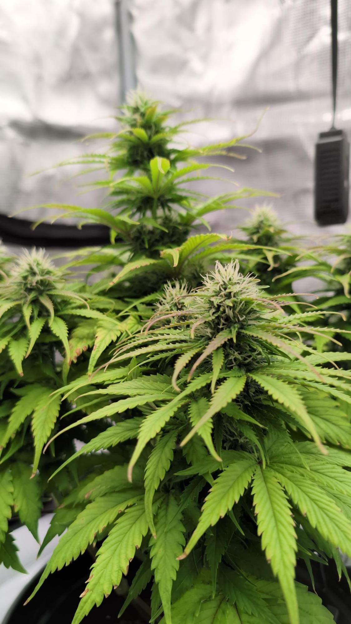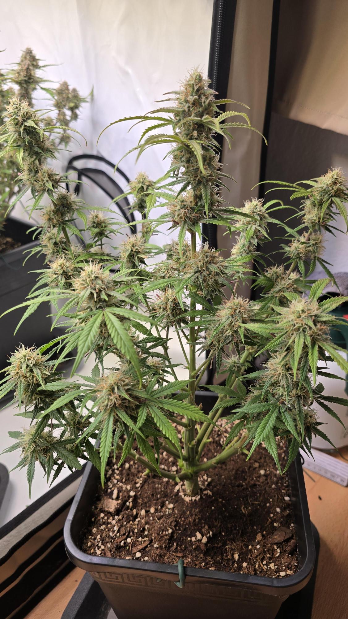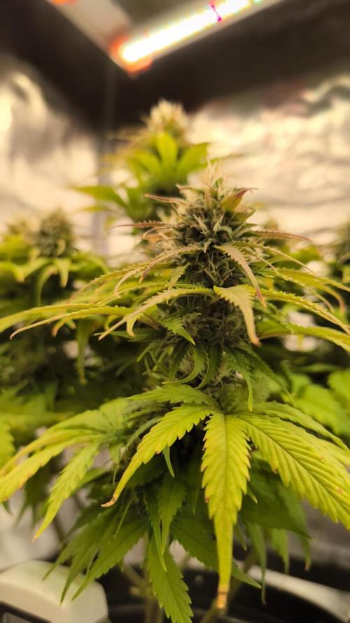 She has a hybrid top structure that may lean slightly more towards the Sativa side, with the possible development of ‘foxtails’. But even these buds are certainly not fluffy, instead they become quite hard and compact. The beautiful layer of trichomes and the bright orange pistils complete the picture.