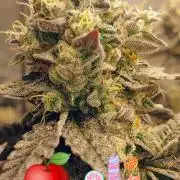 Elev8 Seeds’ Apple Candie is a highly productive feminized hybrid variety renowned for its robust genetic composition, which was derived from the crossbreeding of Apple Fritter and Runtz strains. This cultivar combines the finest qualities of both parent strains, resulting in a potent THC concentration that can reach up to 32 percent. The flowering period of this strain is relatively short, ranging from 8 to 9 weeks, yielding vibrant, frosted buds with shades of purple and violet. The terpenic profile of Apple Candy is characterized by a sweet and earthy aroma, with subtle hints of cheesy apple confectionery and fruity notes reminiscent of Runtz, including tropical citrus and tart berries. Apple Candy stands out for its vigor, dense resin production, and powerful, well-balanced effects, making it an ideal choice for both cultivators and consumers.