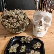 GMO Cookies, also known as Garlic Cookies, is a heavily Indica dominant hybrid strain that was born after a potent Chem dawg x Girl Scout Cookies strain. Ultra violet GMO is a combination of the populair MK ultra (purple pheno) and the famous GMO. Containing an 80% indica and 20% sative it packs a good knock out punch This weed has an average THC level that ranges from 24% to 30%, which makes it a slightly above common THC level on the market. Inexperienced users should proceed with caution not to get overwhelmed with its sedative effects. The buds don't turn purple as you should expect from the name. However it is possible to give it that violet coating by lowering the night temperature in the last 3 weeks. Growing like a real indica it is a short and bushy plant with a main cola dominance. This plant is not suited for topping or LST but is very suited to grow in places with limited height. The flavours are very close to the original garlic cookies as the MK ultra is cross between G13 and OG kush it has subtle hints of haze and kush in the background. Super pungent and heavy smell/ flavour The only difference is that Ultra violet GMO has a smoother smoke and a subtle sweet fresh hint in the back.