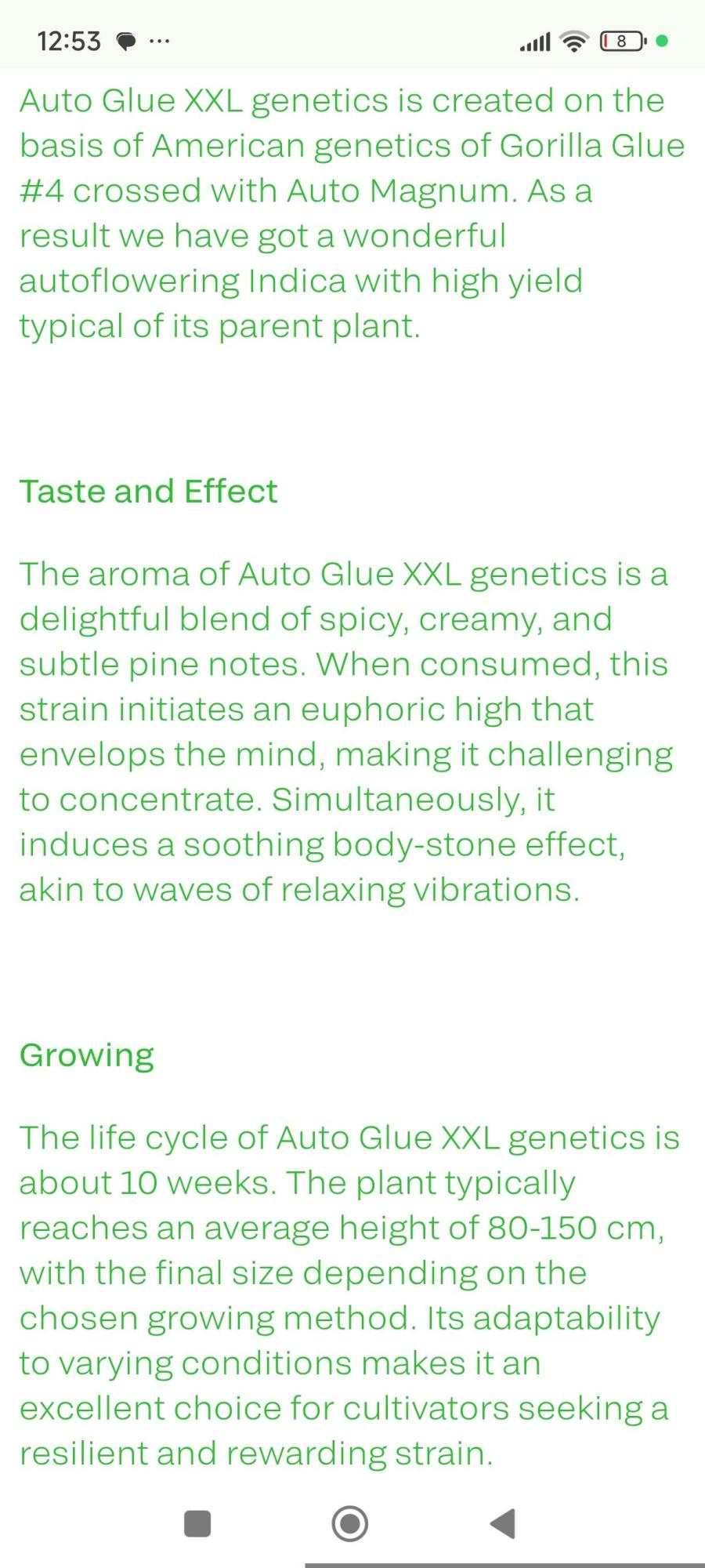 The life cycle of Auto Glue XXL genetics is about 10 weeks. The plant typically reaches an average height of 80-150 cm, with the final size depending on the chosen growing method. Its adaptability to varying conditions makes it an excellent choice for cultivators seeking a resilient and rewarding strain.