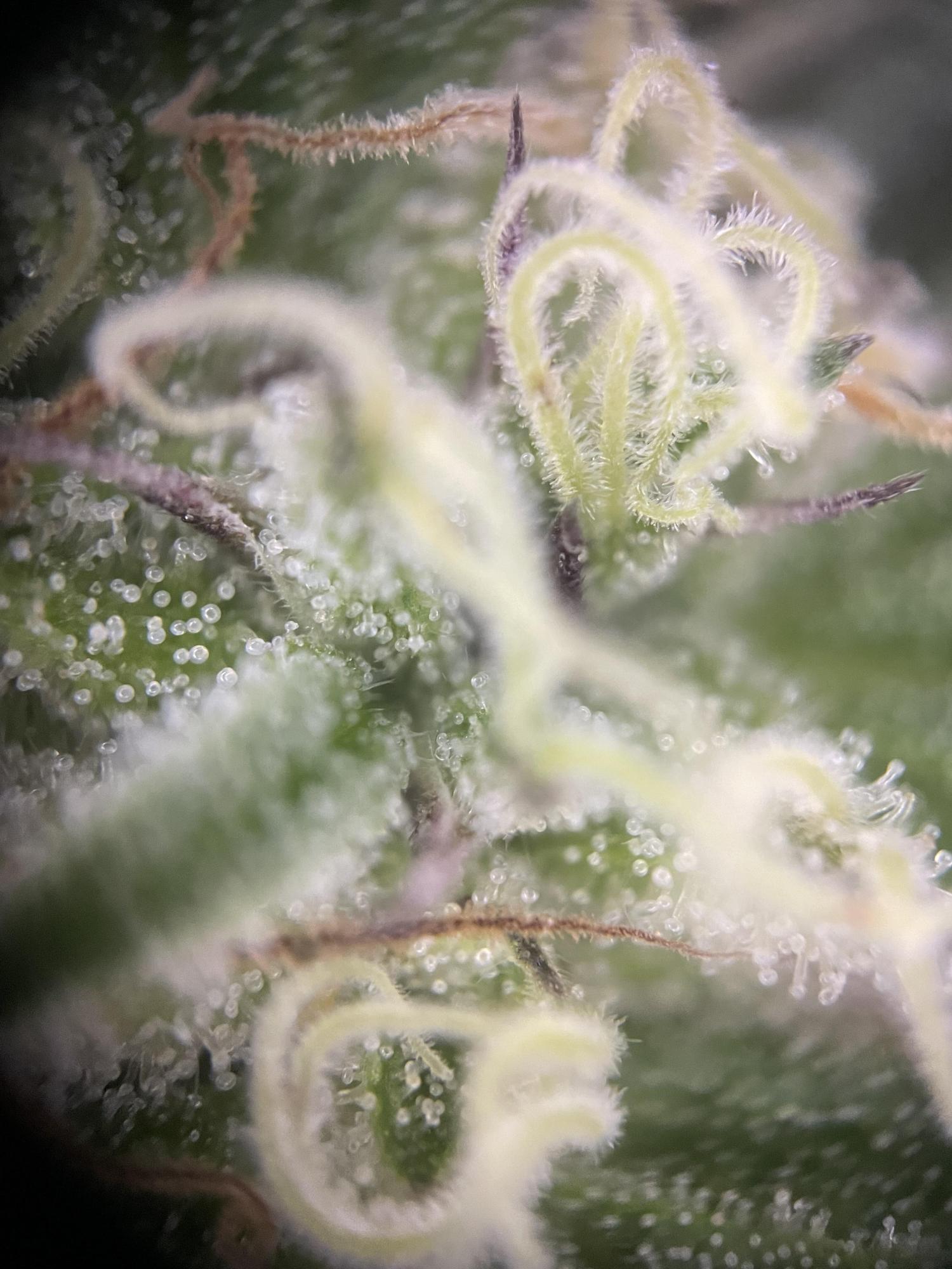 Branches extend outwards, with the lateral branches puffing up with fat crystalline buds which are more indica in characteristic.