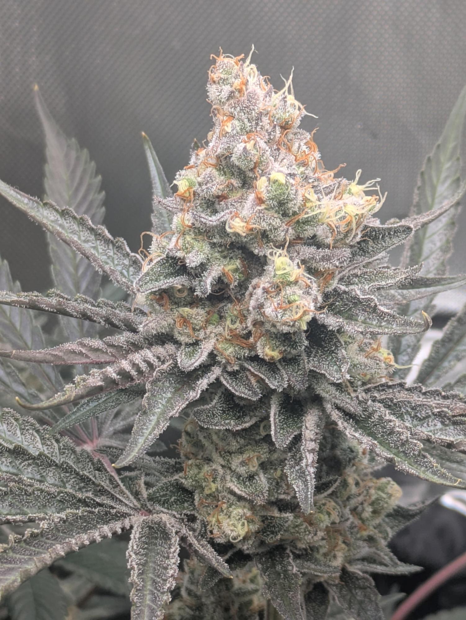 Tangerine Sorbet plants show great uniformity in their robust growth, developing multiple flower heads up and down the plant on their elongated branches. Buds grow large and dense, grouped around a towering fat central cola. The stupendous resin production extends all the way to bigger leaves and the buds themselves are wrapped in a blanket of trichome frost, just like a sorbet picked straight out of the freezer!