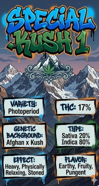 As a member of the legendary Kush lineage, you can expect Special Kush 1 to bathe your mind in a state of euphoria. Let your worries wash away as this progeny of Afghan and Kush does its thing. Consider adding this strain to your collection if you are subject to a short growing season—its flowering time of 7–8 weeks means the buds are ready to process by late September. Enjoy a yield of up to 475g/m² indoors and 500–550g/plant outdoors.