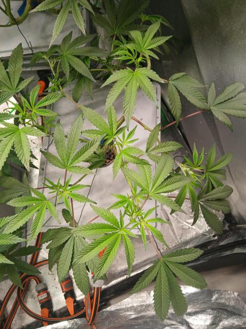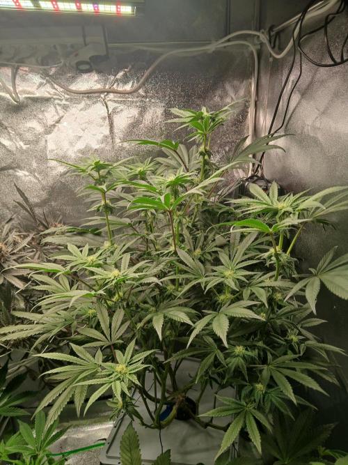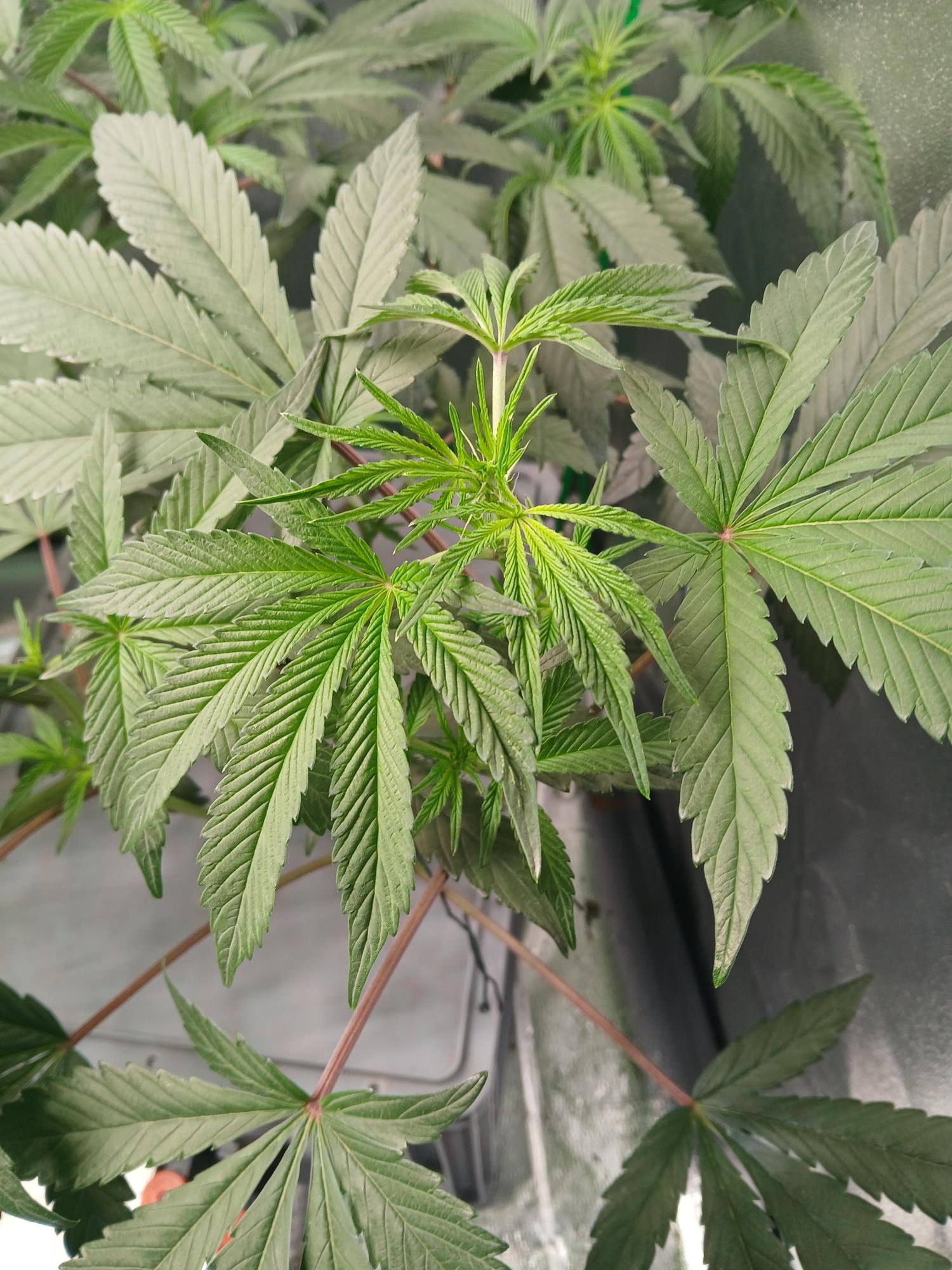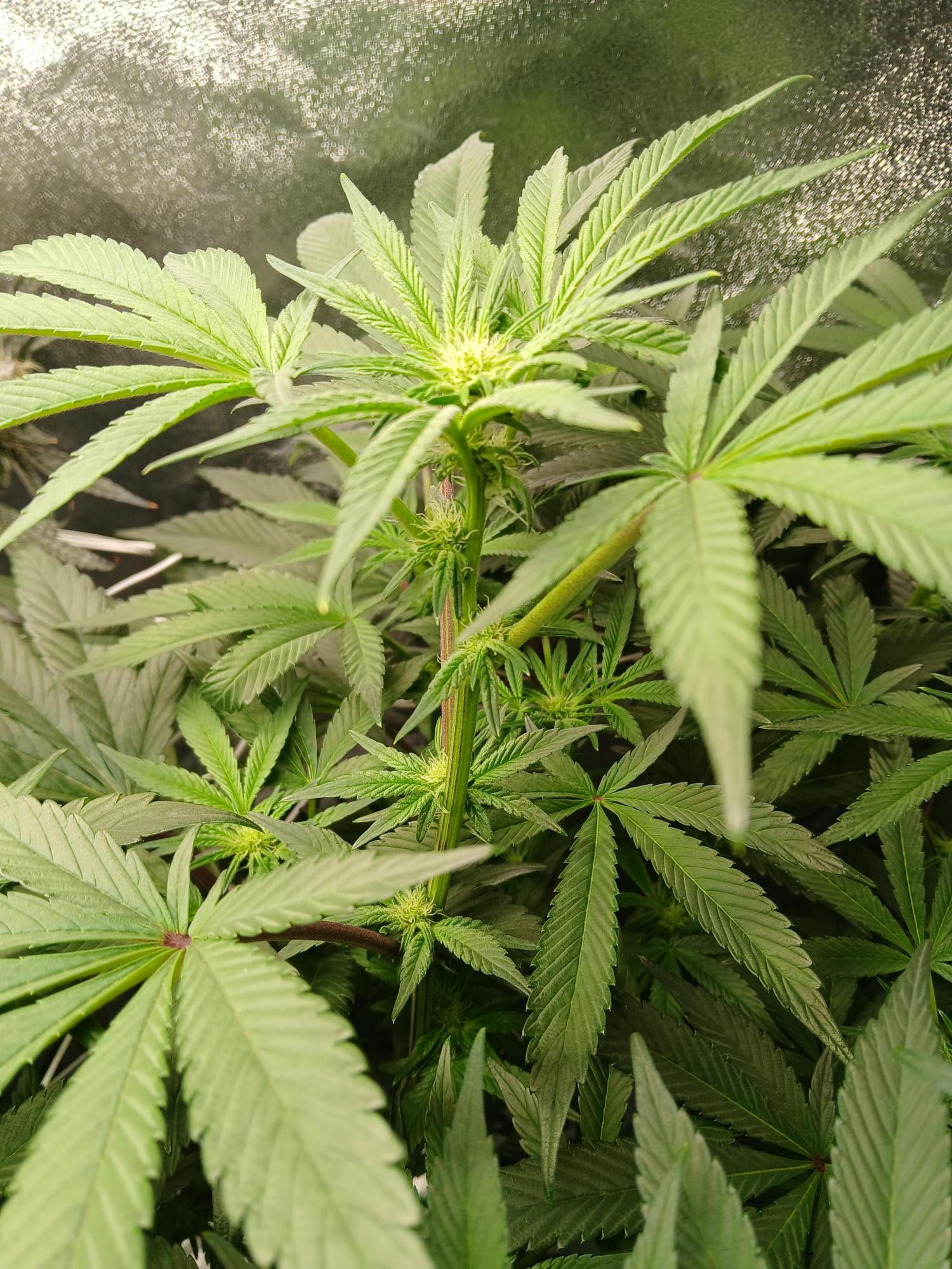 The plant’s dense, resin-coated buds develop an attractive mix of light green and purple hues as they mature. The balanced leaf-to-calyx ratio makes trimming straightforward, while the compact structure is ideal for controlled environments.