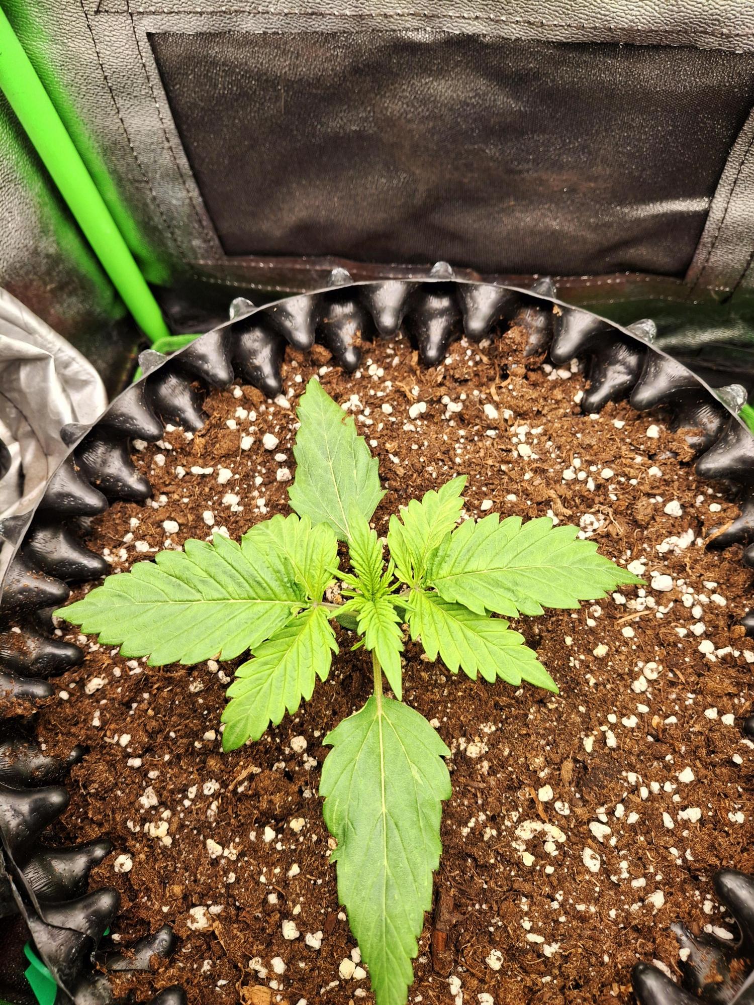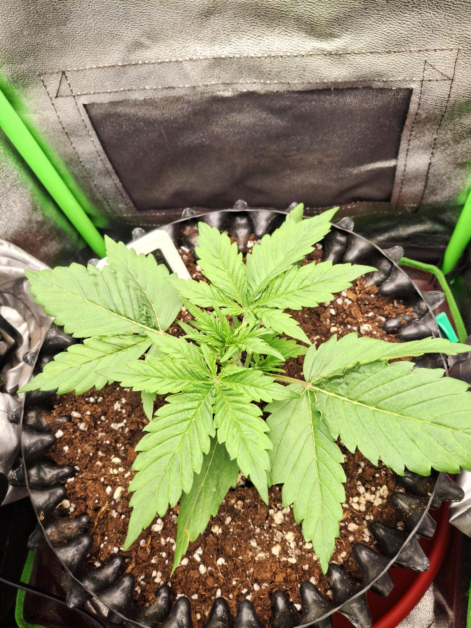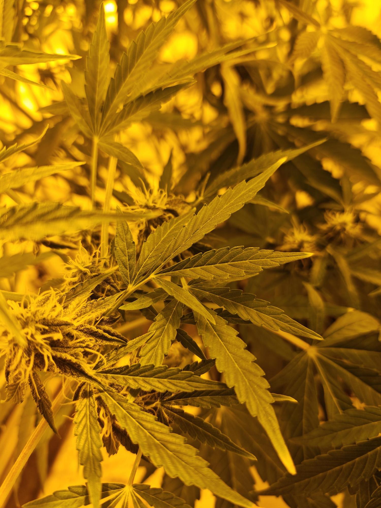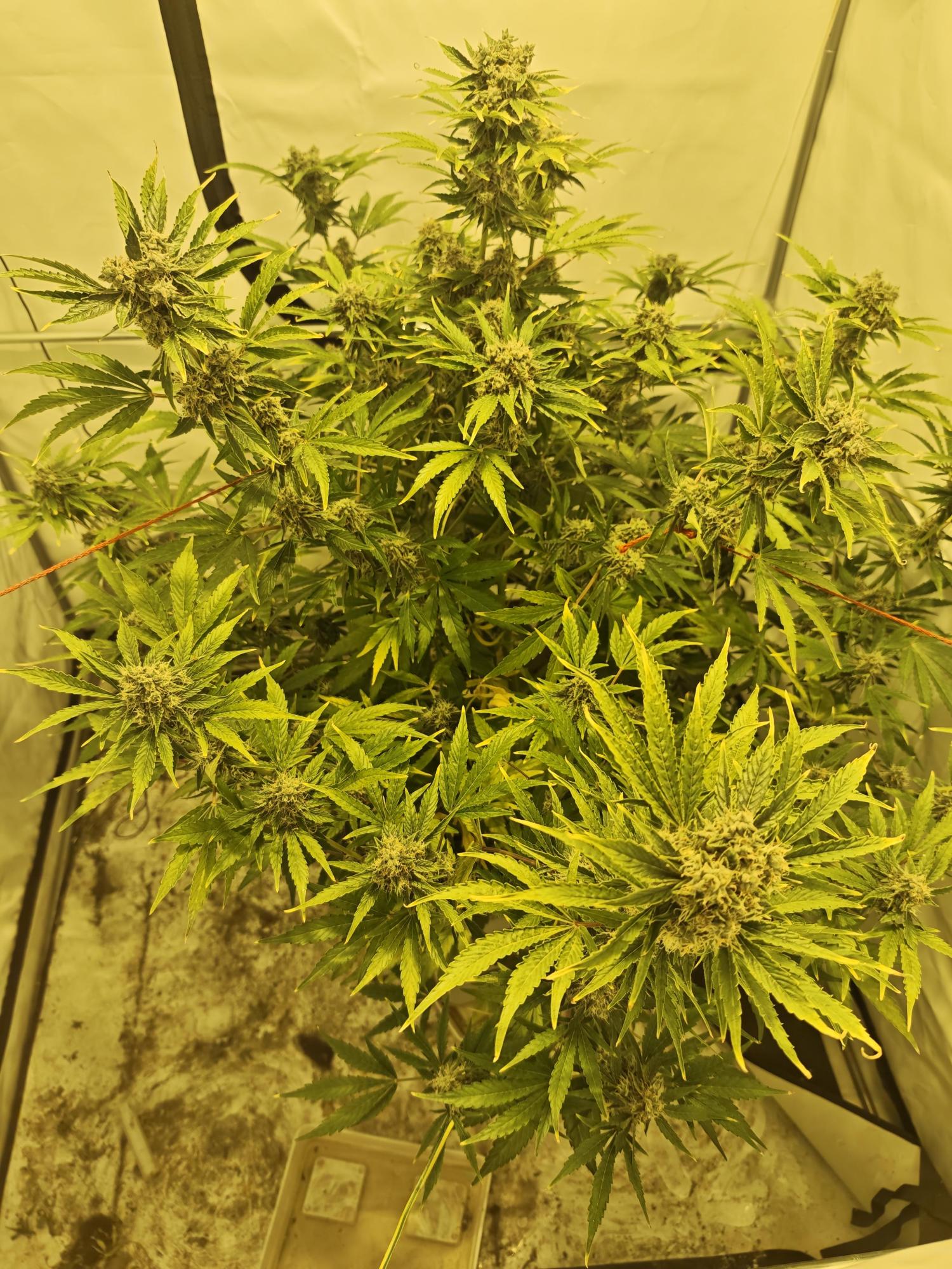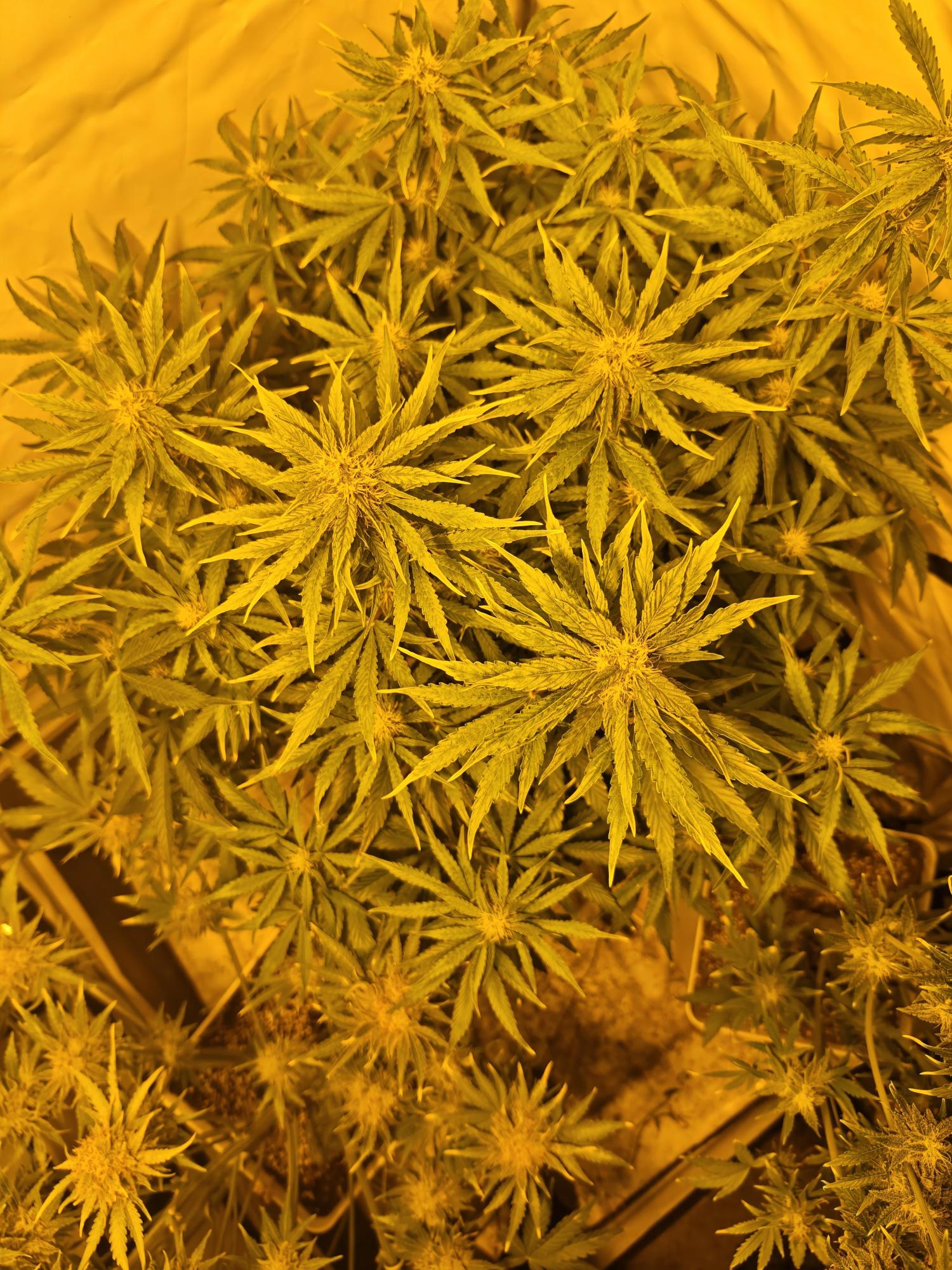 This indica-dominant variety develops a bushy, symmetrical form that supports dense, resin-rich colas on every branch. Flowers form quickly, merging into large, chunky clusters that glisten under light. From a distance, the abundant orange stigmas give the plant a distinctly golden-orange hue.