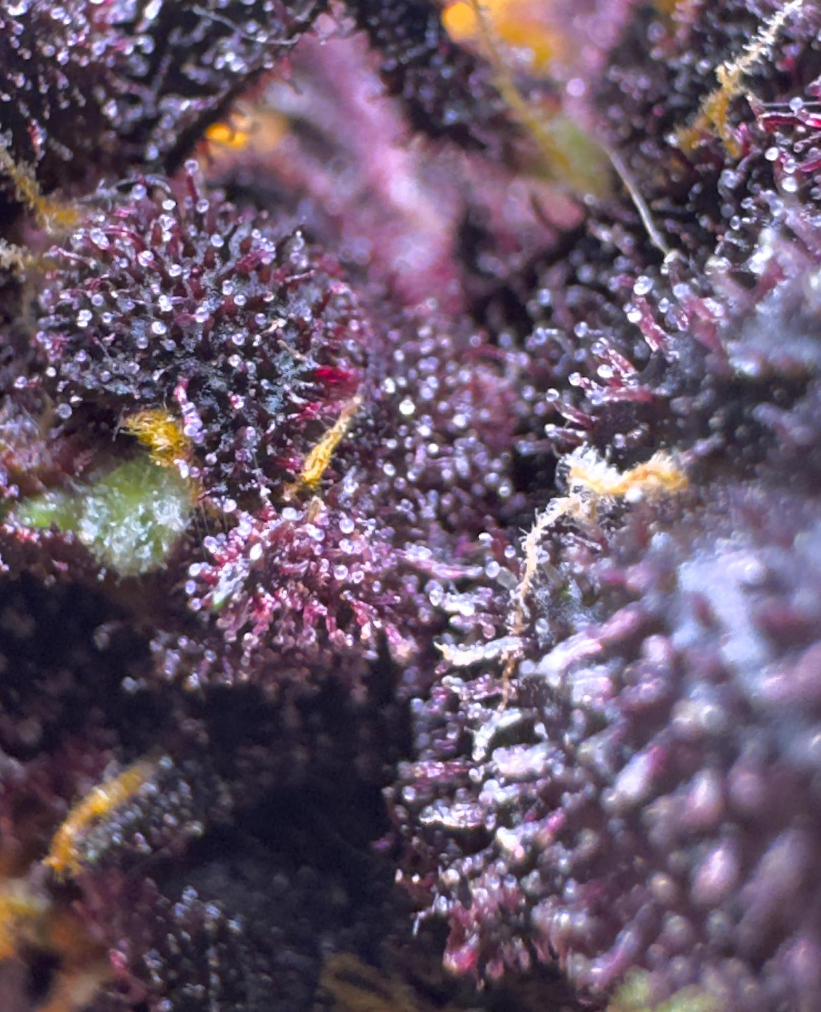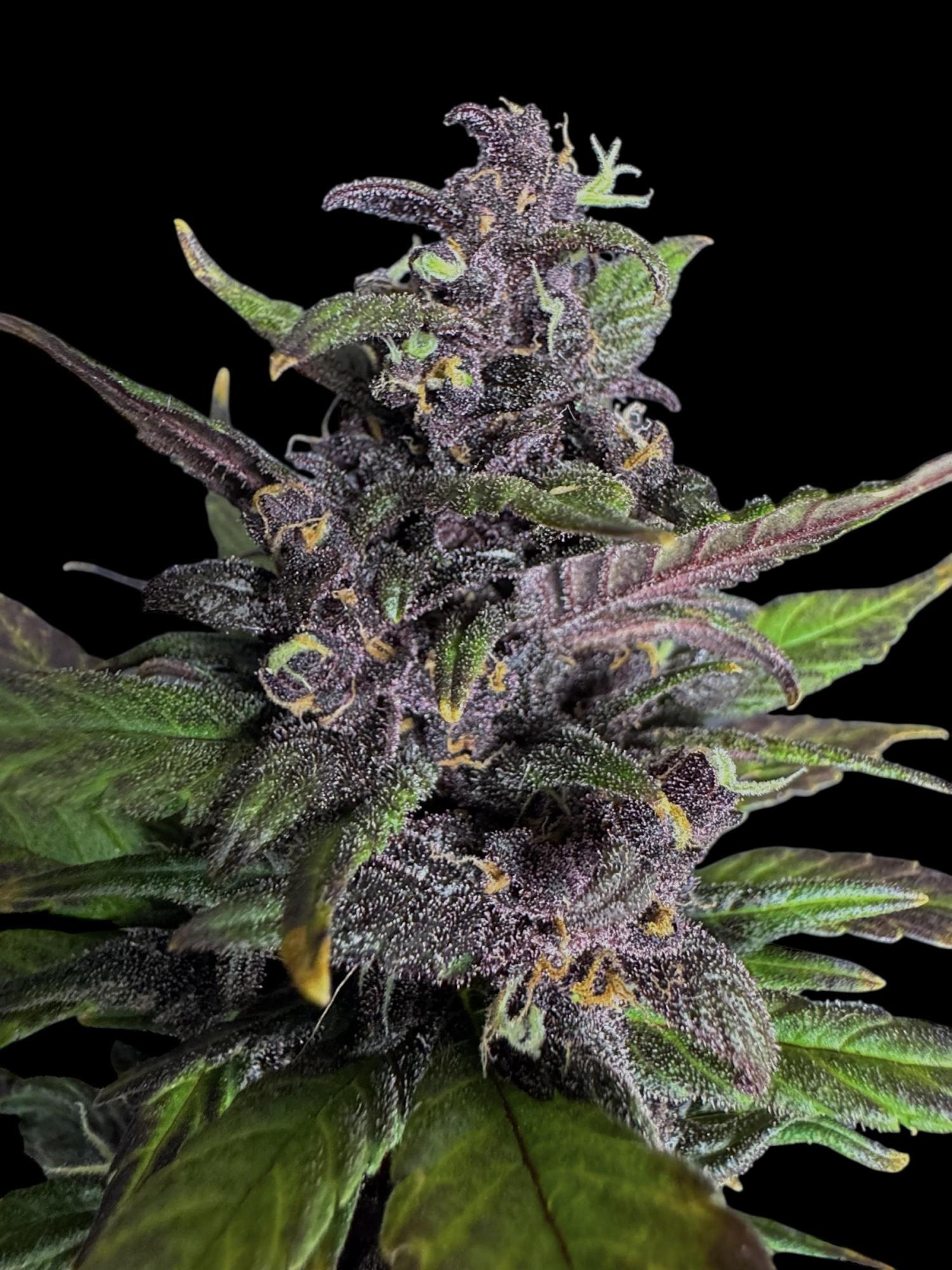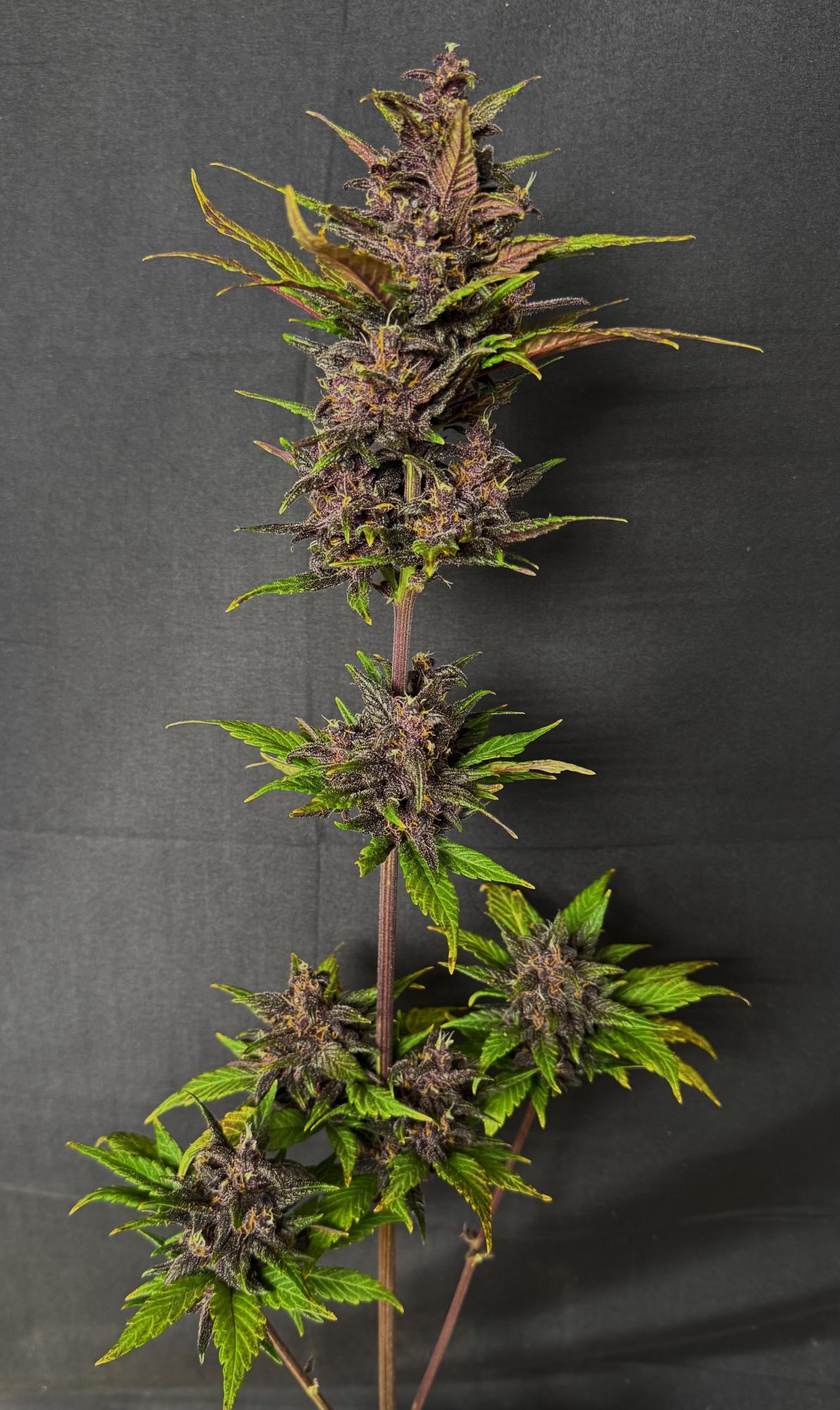 Autoflowering strain. This polihybrid is the result from the crossing of two selected strain of our purple flowered varieties: Dark Devil Auto® (SWS38) (SWS38) and Black Cream Auto® (SWS37). This strain shows a great hybrid vigor since germination, developing the typical structure of an indica-sativa hybrid, with a strong main stem, surrounded by multiple buds on the side branches also with a good caliber and density. Tall-stemmed autoflowering strain. Some specimens can reach one meter in height, all this in just two months from the germination of the seeds. The aroma is sweet and fruity with hints of incense and lemony citrus tones. The plants produce copious amounts of aromatic resin with a powerful and exciting effect.