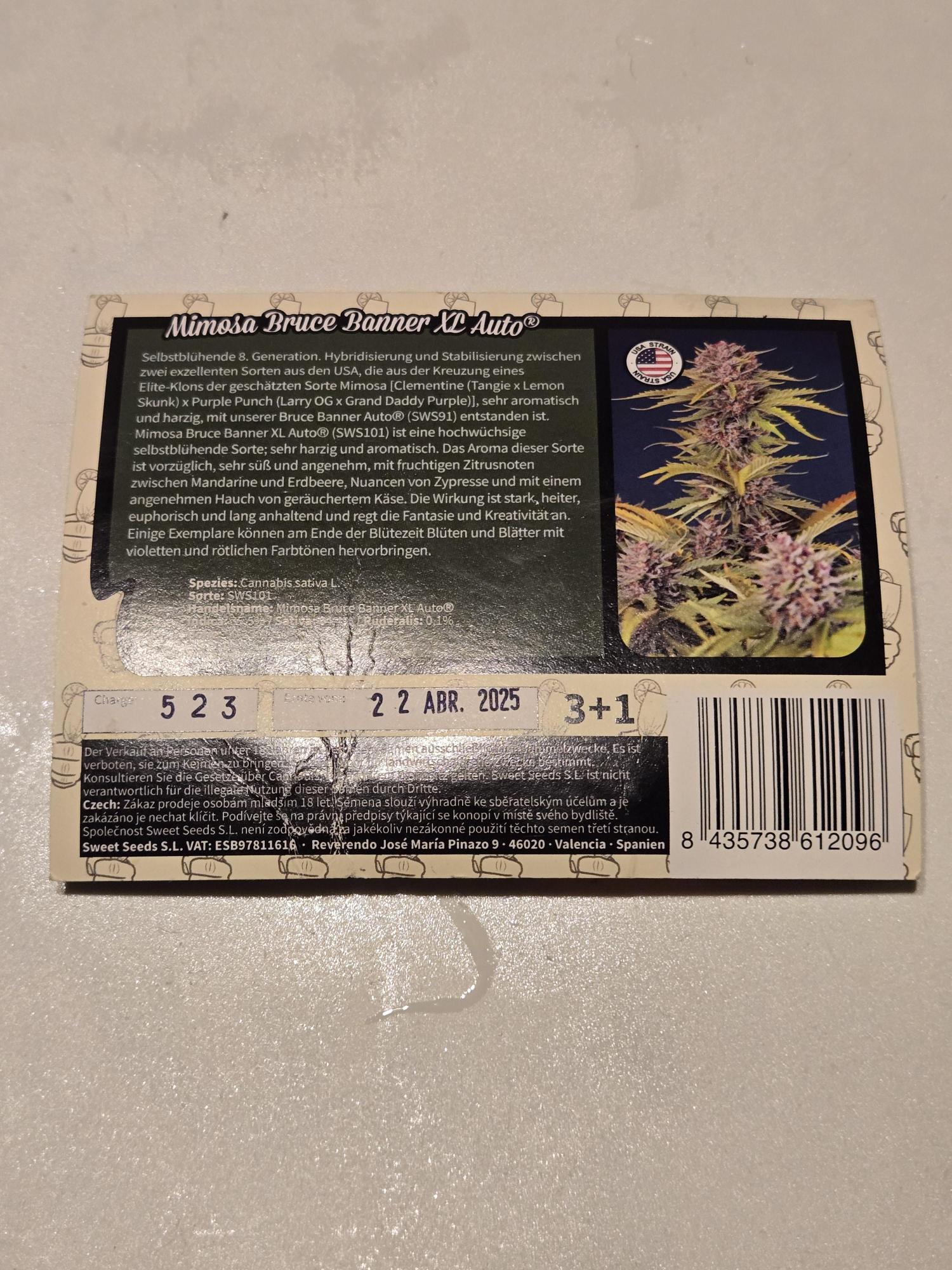 An 8th Generation autoflowering strain. The stable hybridization of two excellent strains developed from US genetics. The product of crossing a specially selected very aromatic and resinous elite clone from the popular Mimosa family [Clementine (Tangie x Lemon Skunk) x Purple Punch (Larry OG x Grand Daddy Purple)] with our own Bruce Banner Auto® (SWS91). Mimosa Bruce Banner XL Auto® (SWS101) is an extra-large autoflowering strain with highly resinous and aromatic buds. These plants have a truly exquisite scent that is particularly sweet and attractive, with shades of citrus fruits reminiscent of mandarin and strawberry, fresh cypress, and pleasant undertones of smoked cheese. It has a potent, happy, even euphoric, and long-lasting effect that enhances the imagination and creativity. Some plants develop flowers and leaves with purple and reddish hues at the end of the flowering period.