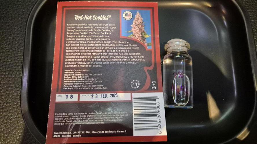 Top-quality genetic as a result of crossing a clone of an American “Super Strong” Cookie strain – Tropicanna Cookies – with a clone selected from a second American strain – the potent, mandarin-scented Tangie (Girl Scout Cookies x Tangie). We chose exotic lineages with red flower phenotypes when crossing these two varieties. The red flowers develop in around 60% of the offspring and tend to appear in the last few weeks of flowering, beginning with the lower branches and flowers before spreading to the top of the plant. Red Hot Cookies® (SWS83) is a “Super Strong”, highly productive and resinous strain with high THC levels of up to 25%. It has an excellent scent and taste; it is sweet, deep and dense, with marked tones of mandarin and mango, plus hints of fruits of the forest.
