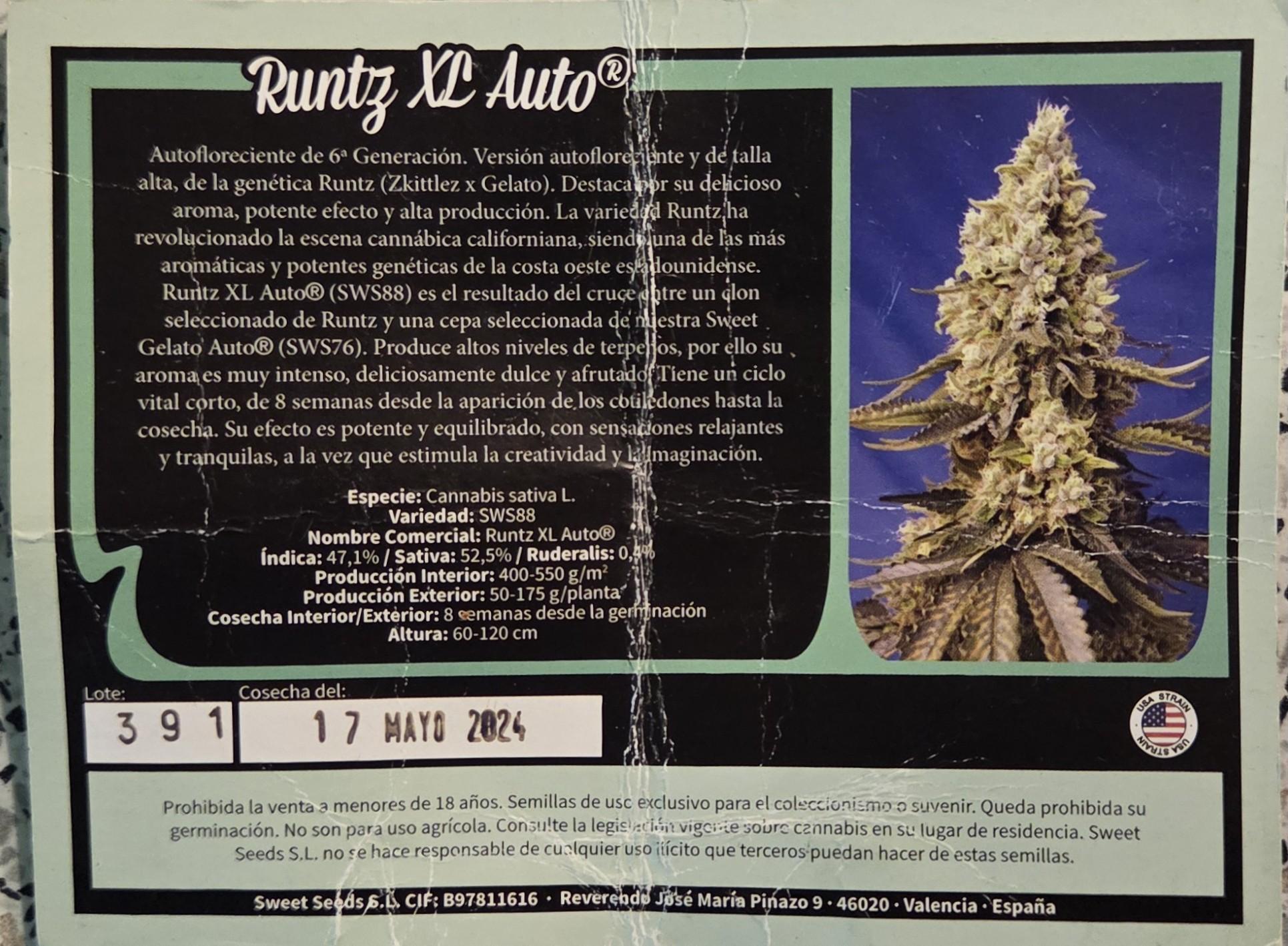 A 6th Generation autoflowering strain. This is our extra large, autoflowering version derived from the Runtz genetic line (Zkittlez x Gelato). The strain is notable for its delicious aroma, strong effects and high yields. The Runtz strain has revolutionized the Californian marijuana scene and it is one of the most aromatic and potent genotypes on the West Coast of the USA. Runtz XL Auto® (SWS88) is the product of crossing a carefully selected Runtz clone with handpicked individuals from our Sweet Gelato Auto® (SWS76) strain. It contains high terpene concentrations, which lends the buds their very intense, delightfully sweet and fruity bouquet. It has a short life cycle, with just 8 weeks from the appearance of the cotyledons until harvest. Its effect is powerful and well-balanced, producing peaceful, relaxing vibes, while stimulating creativity and the imagination.