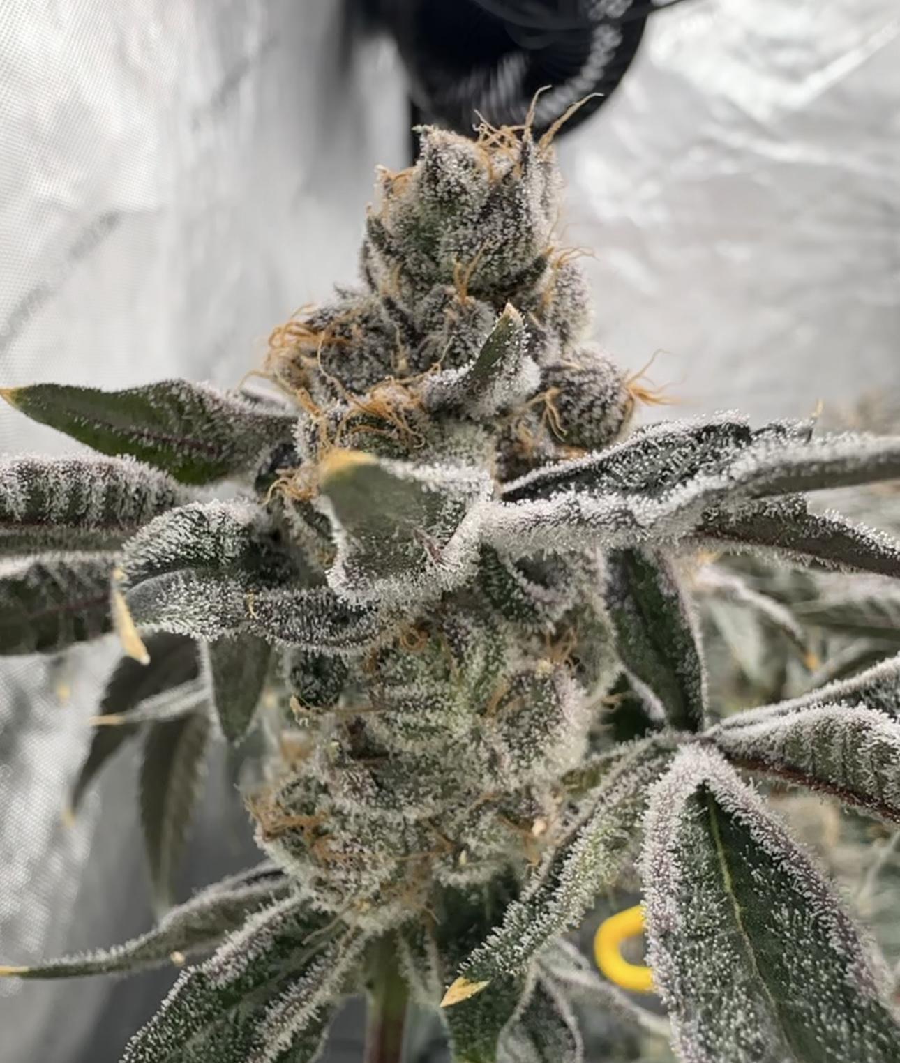 Blue Zushi is a largely indica dominated hybrid bred by crossing Zkittlez and Kush Mints. The initial flavor hits with a wave of tropical fruity sweetness, with distinct notes of berries and citrus, with earthy, minty undertones that deliver a refreshing finish. Its heavy indica high delivers a floating euphoria combined with deep relaxation. Growers will discover she’s an easy strain to grow, with vigorous growth and adaptability to a variety of conditions. Her long, heavy colas could require support later to keep branches from snapping or bending. Colder nighttime temps in the last weeks of flower will help bring out its purple hues. With a flowering time of 56-63 days, this strain delivers high yields of lime green, purple, and bright blue buds with a generous coating of shimmery trichome crystals.