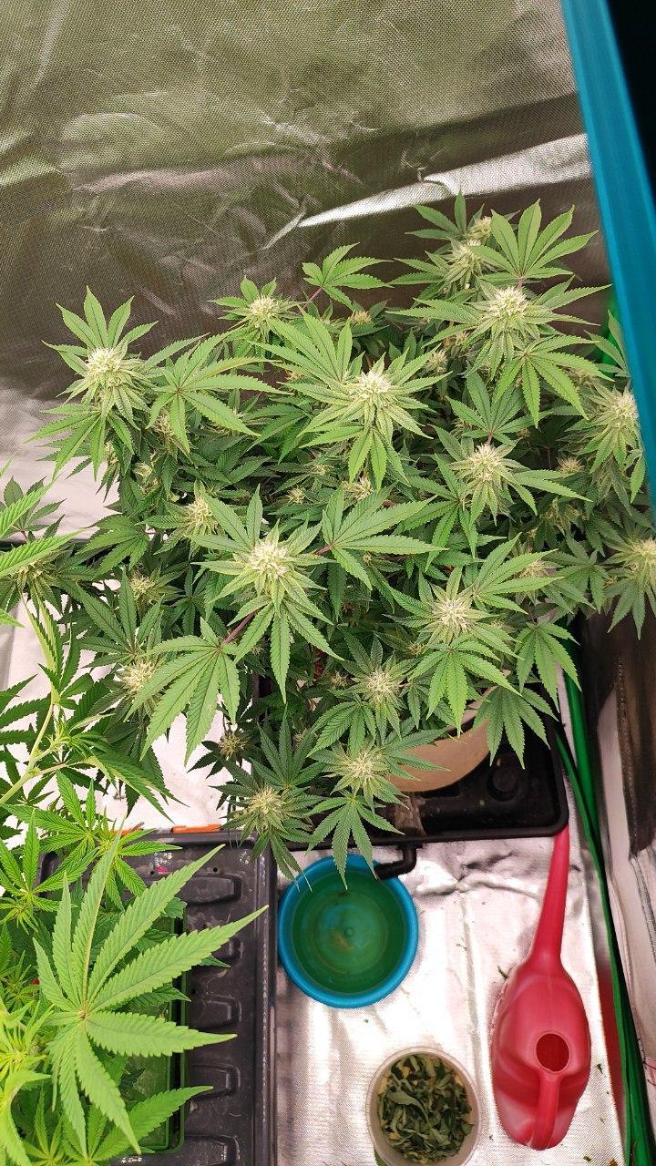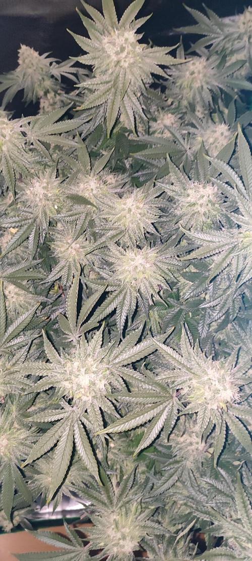 High-yielding variety, large buds with creamy biscuit taste. When smoked, the aroma of the 50 Dragons strain opens up and smells like a pastry bakery. The variety has green buds and a light fruit and berry taste of cookies. Good for ScrOG growing, forms lots of stakes like 50 silver dragon heads. Light inflorescences are abundantly strewn with white trichomes, and notes of strawberry and banana are felt in the aroma. THC content can be reached 27% high yielding variety Warning! Not recommended for people with a low threshold of tolerance!