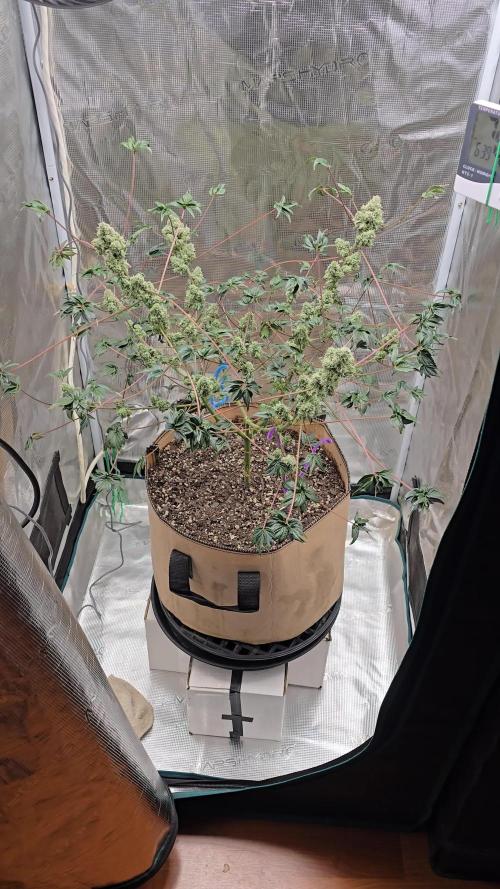 2/11/2024: a few of the pistols are starting to darken and she is starting to smell more and more each day. At this point I'm getting a sweet and floral smell. Don't mind the trellis net in the picture, it's for the other two photo period plants growing next to her.