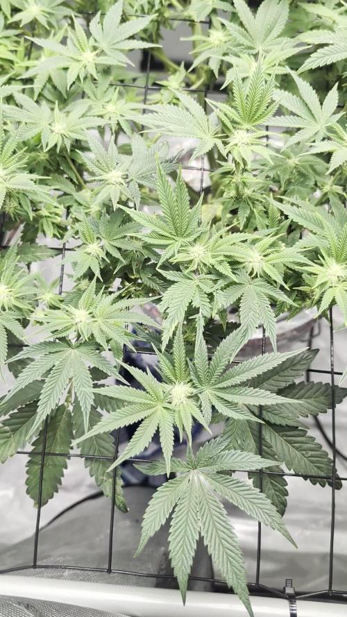 Hello everyone! I promised to track this grow very closely this time and ufortunately life got in the way. Here is a quick sumup of the grow. First of all- One of the sour stomper plants unfortunately didn't make it. It died at about week 4. The main stem somehow had rubbed/broken down. That's why it was falling down. It was almost like a mini beaver had chewed it off at the point where the stem touches the riot rooter. At first I thought nothing much of it, maybe it hasn't been rooted in quite well yet or something. And I was constantly touiching it when watering, that made it worse. Soo the leaves were dropping and the plant looked very weak. Then I decided cut thr rapid rooters top layer and found out the severity of the problem. Tried to tape it up and other things, but it was too late. At the end it appeared all good as the remaing plants got so big the I had some space issue so I wouldn't have been able to fit another plant in anyway. At that time I finally made my self-draining saucers. I took me a while and a lot of effort, but finally they were ready and working well. I also installed the self watering system and flowering was starting. Pretty soon I started noticing weird leaf symtoms. Brown spots, different kind. Some plants had it more, some less. Sour Stomper looked pretty good throughout the grow. Mango smiles seemed sensitive and Strawberry Nuggs were pretty strong until the end. The grow was basically me experimenting with the setup- changing watering schedules , changing ppm, ph and all that stuff to keep the leaves looking healthy and it was very hard I have to admit. Probably my hardest grow in that regard. But somehow, the bud leaves remained healthy and the buds really fattened up good. I got away with an amzing 700G dry bud harvest which was def a new record from one grow. And the bud quality is very good too! Next time definetly no more than 4 plants as they got pretty big and I thought it was a little overcrowded. I was doing some good defoliation too. I should have defolited strawberry nugs more tho. Sour Stomper got some amazing bud development from top to bottom because it was was growing next to strawberry nuggets which were really small most of the grow. They actually took the most time to harvest even longer than Mango smile. Mango smiles were ready quite early. Sour Stomper was just in time! I topped sour stomper and both Mangoi smiles, left SNs both normal. Looking back at it, the way I grow them, Should have topped SNs too. Would probably have more space in the middle and longer side branches. Probably wouldn't have been as bushy! I followed the full Terra aquatica feed chart until the end. I was supplementing with CalMag a lot as I thought the symptoms could have been from a CalMag deficiency as this was my first grow with RO water. Overall a very challenging but good grow at the end. First time no mold problems. A record breaking yield for me. Basically surpassed the upper limit for all plant probable harvest sizes. Got good smelling quality bud. Very happy overall and will continue experimenting with Mephisto beans in the future for sure! I guess what I like the most about Mephisto is how close to description the plant is, very stable genes in that regard. Next time I will also have to start feeding plants higher PPM feed faster at the very start. and during flowering. But still not 100% sure what caused the leaf symptoms.