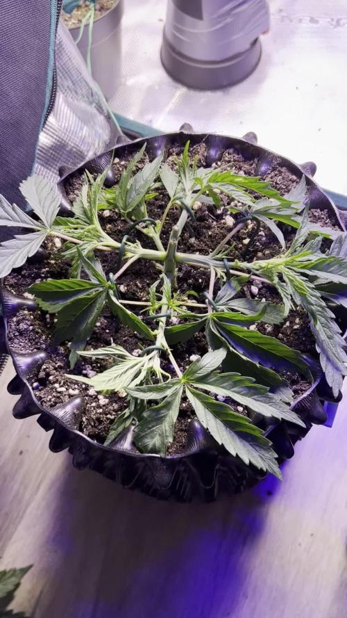 LST und Topping sind die Schritte die jetzt anstehen. LST muss täglich wenn nicht sogar mehrfach täglich ausgeführt und kontrolliert werden, um zu gewährleisten, dass die gewünschte Pflanzenstruktur erstellt wird. Wie auf den Bildern zu sehen ist, hat die Dame vorne links weniger Triebe. Beim Training hat sich einer bereits verabschiedet (Durch Unachtsamkeit) und ein Trieb entwickelte sich einfach nicht und wurde entfernt. Beim LST versuche in jeden Trieb in eine eigene Richtung zu biegen und dann senkrecht zum Boden auszurichten.