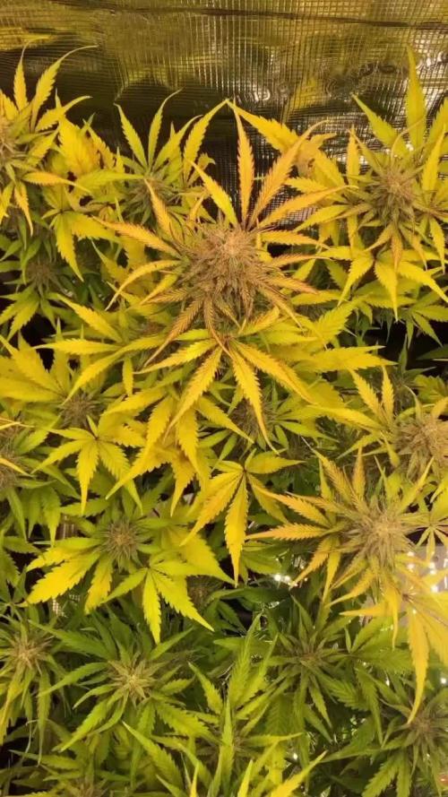 From the images, we can observe the heavy load the stems are carrying. The top colas are thriving with density, their surfaces a landscape of rich, sticky trichomes, the kind that promise potency and depth. While the overall structure of the plant leans heavily, a testament to the weight it bears, there's an elegance to this droop, speaking to the fullness it's achieving.
